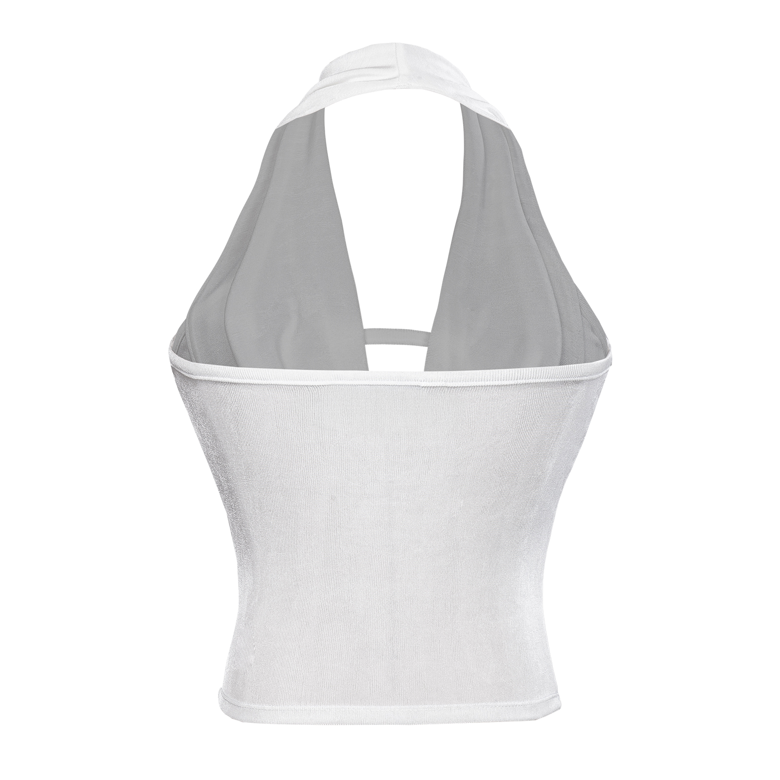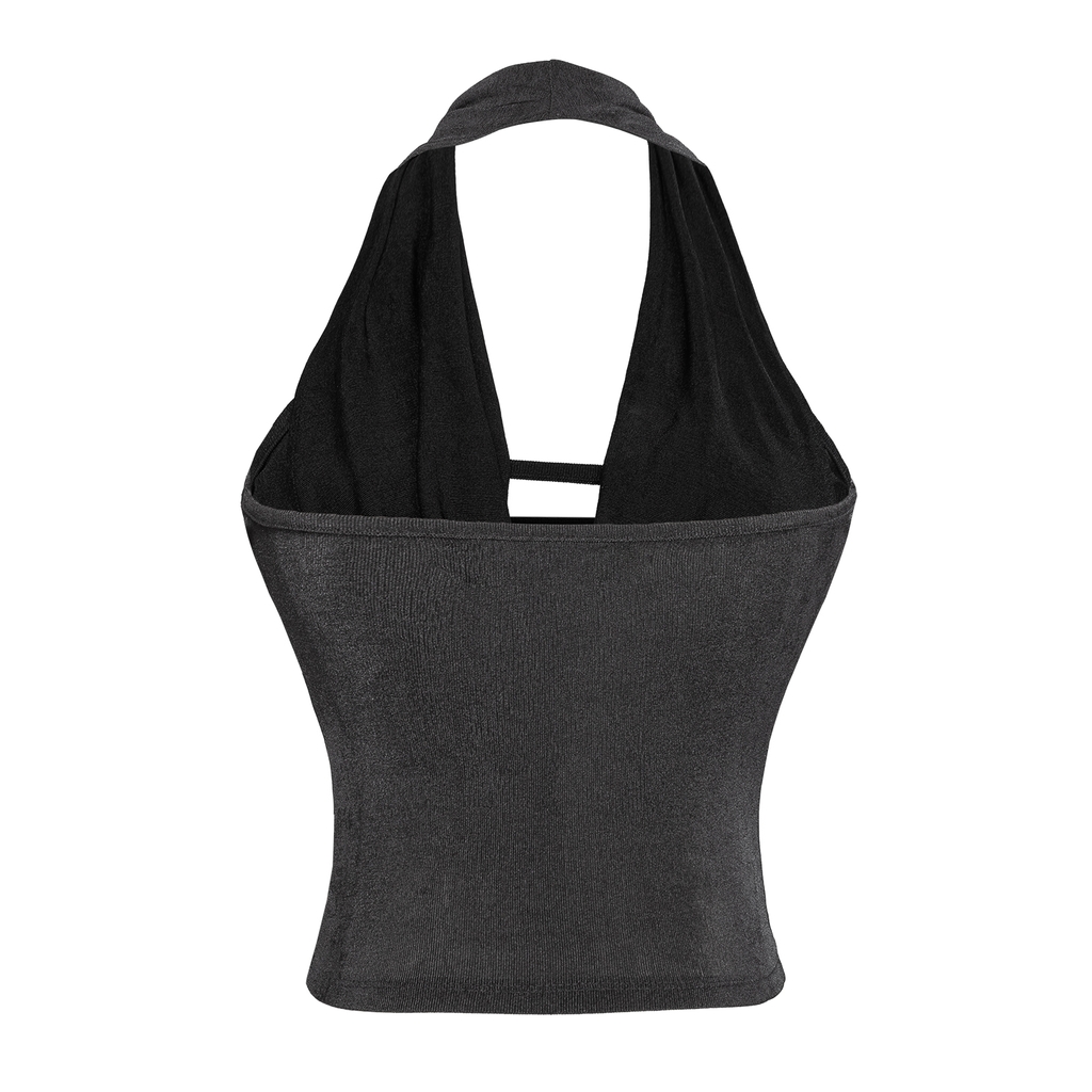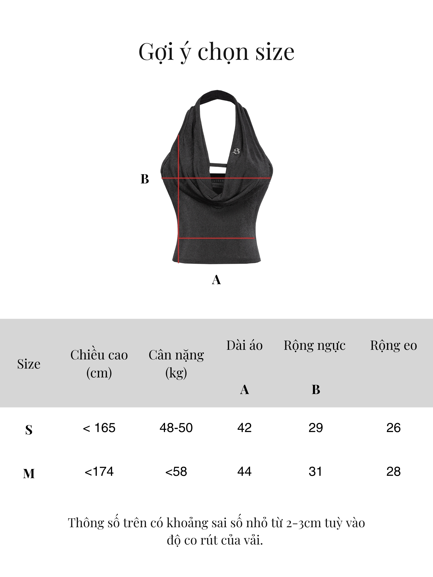 Phom dáng croptop cổ yếm ôm sát, khoe trọn đôi vai và phần lưng trần đầy mê hoặc. Thiết kế cổ đổ mềm mại kết hợp dây đan trước ngực tạo nên một điểm nhìn đầy khiêu khích nhưng vẫn giữ trọn sự tinh tế.