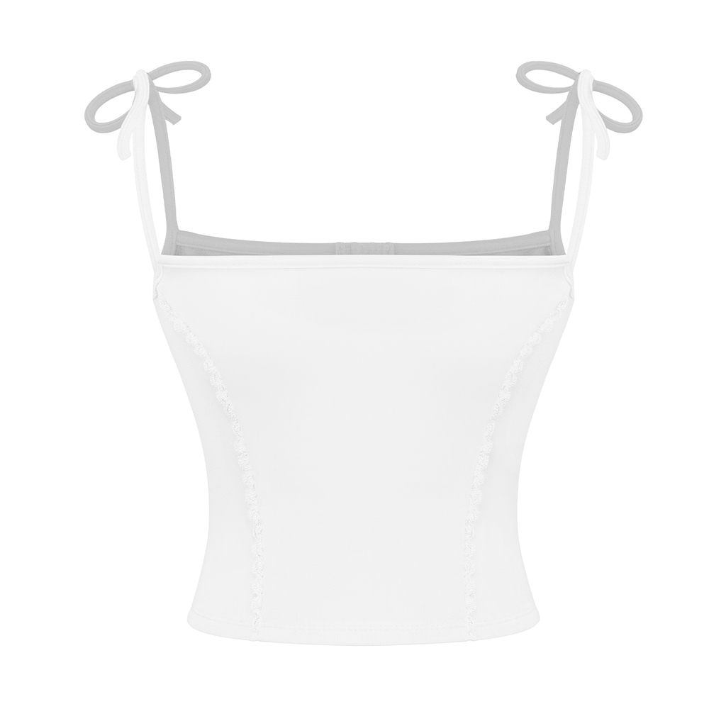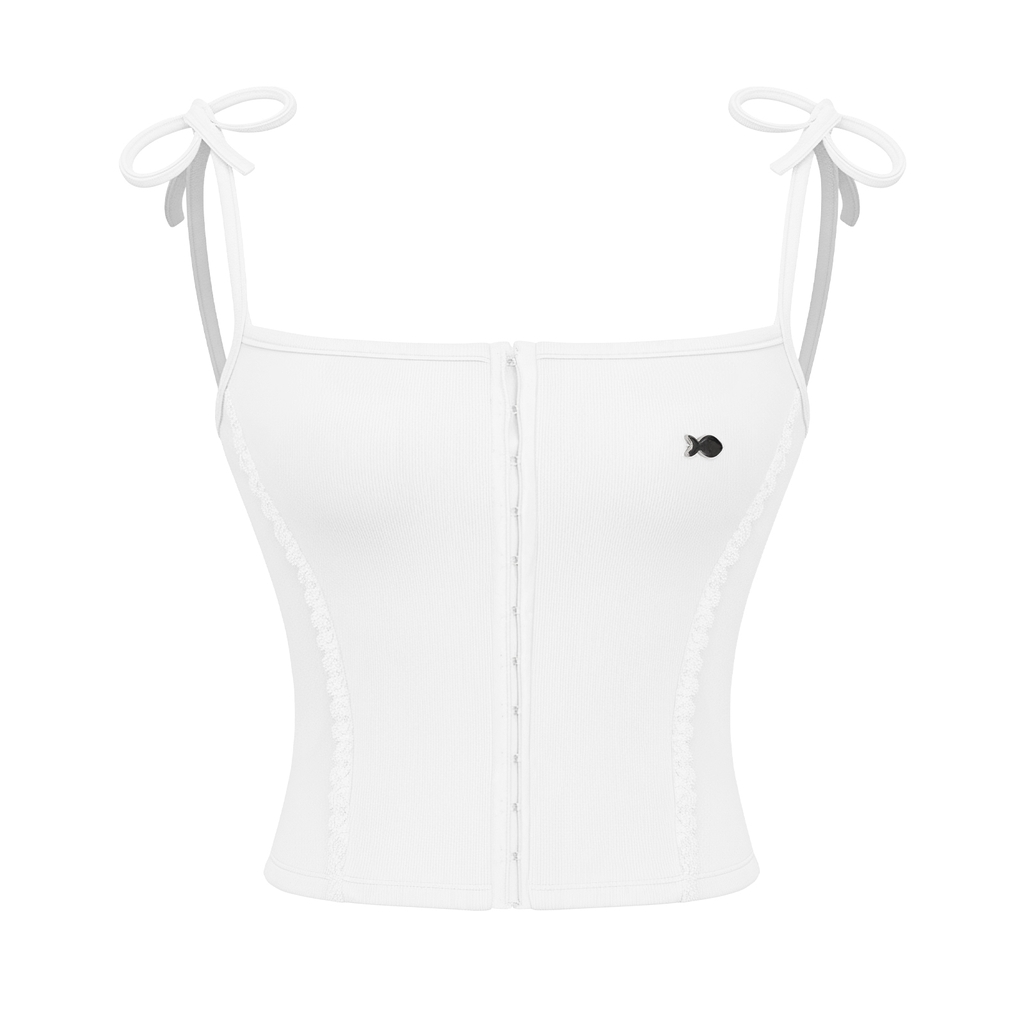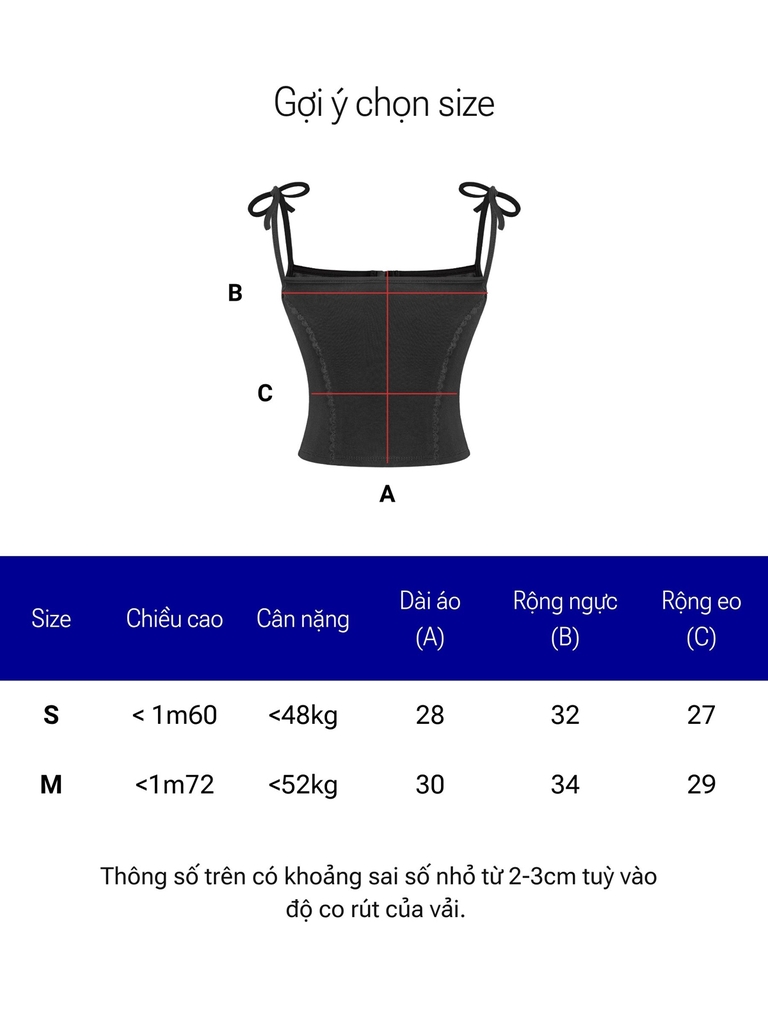 Đây là một thiết kế croptop với kiểu dáng corset 2 dây, ôm trọn thân trên duyên dáng của bé. Điểm nhấn nữ tính tuyệt vời là chi tiết phối viền ren mảnh mai, chạy dọc thân áo, tạo nên họa tiết mềm mại và điệu đà.
