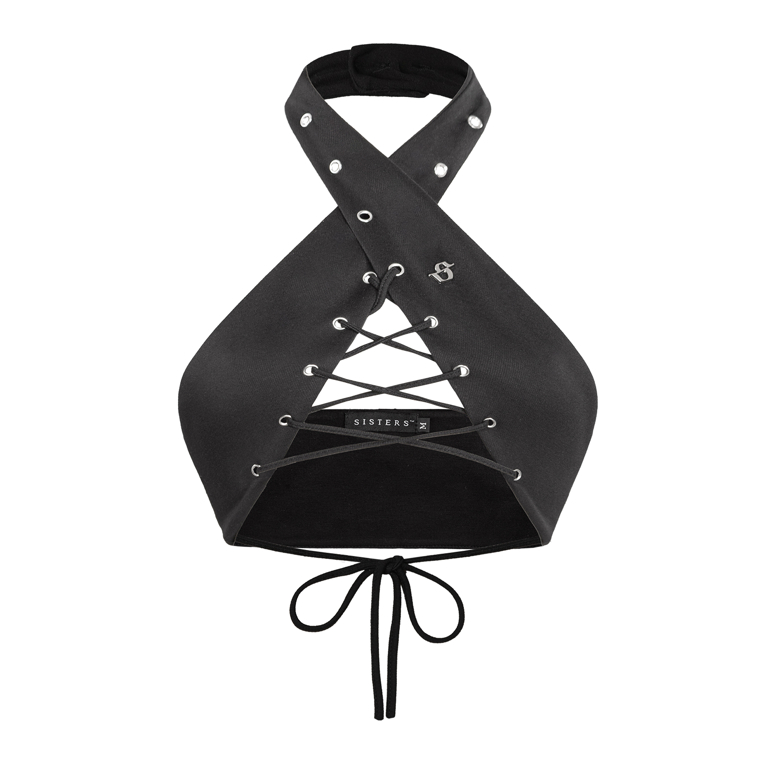 Áo croptop gây ấn tượng với thiết kế vạt chéo ngực đan dây gợi cảm, tạo điểm nhấn hút mắt. Viền khoen kim loại cá tính, phối logo inox sang trọng, khẳng định chất riêng SISTERS.