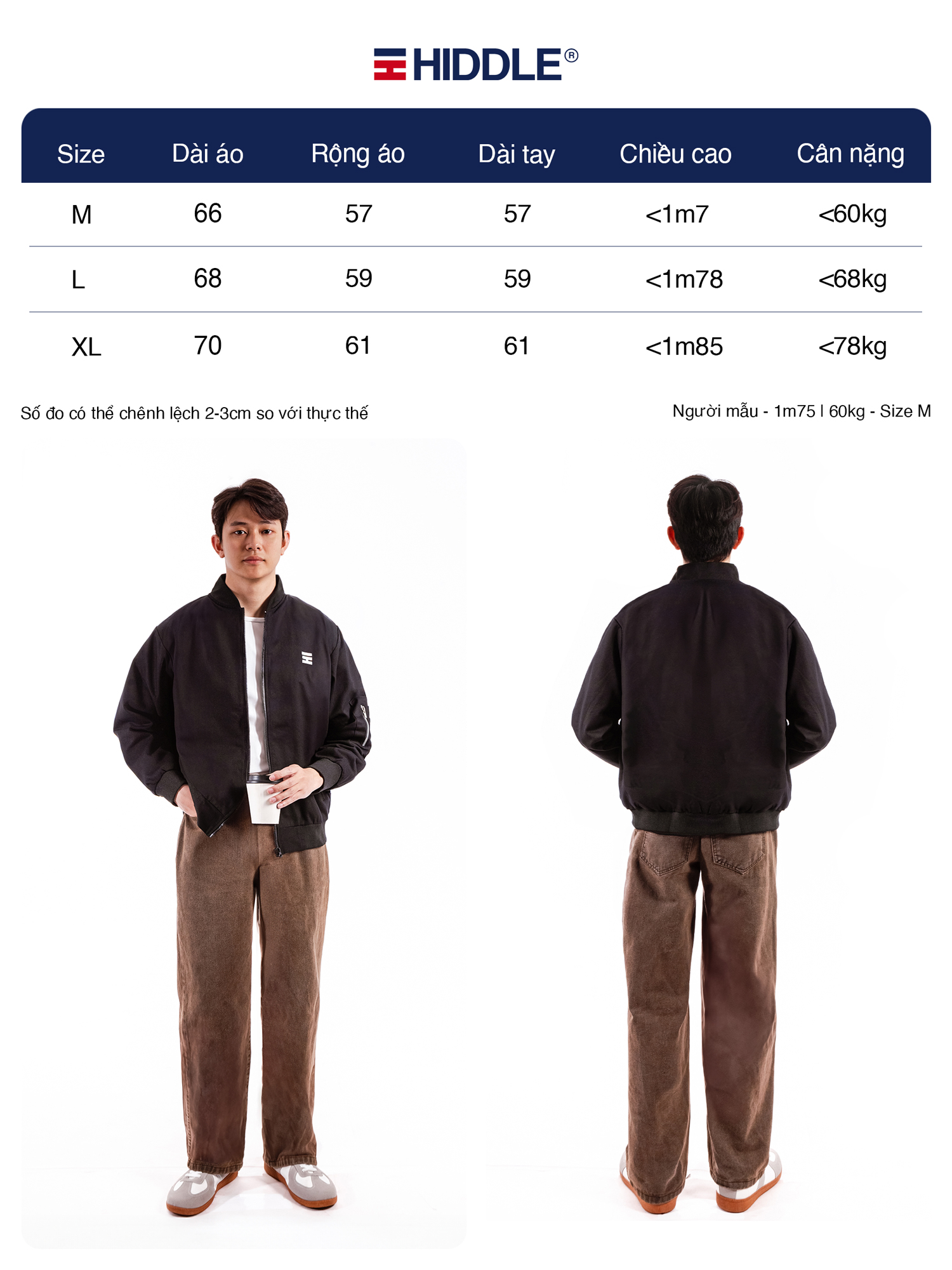 Sau đây Hiddle sẽ chia sẻ thông số size áo khoác bomber nam HIDDLE với hy vọng khách hàng sẽ chọn được size áo vừa vặn với bản thân mình nhất.