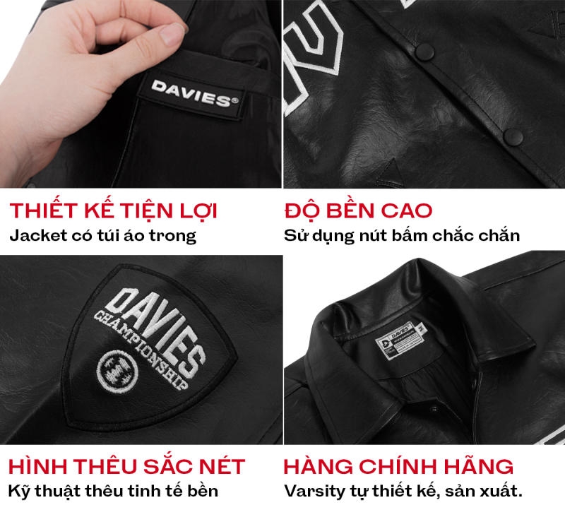 Nếu bạn biết đến áo khoác bóng chày nam Davies thông qua các mẫu varsity kaki phối tay da trước đó, thì sẽ nhìn ra điểm đổi mới rõ rệt trong thiết kế mới. Leather Varsity Jacket được sử dụng chất liệu da hoàn toàn dày dặn và sở hữu nhiều đặc điểm nổi trội.