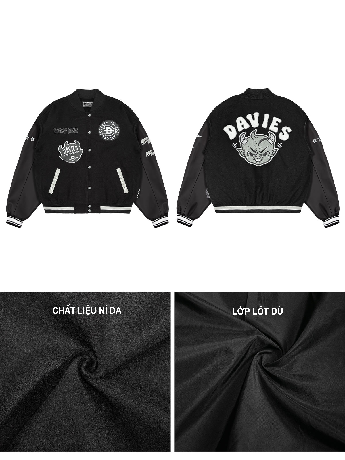 Davies không chỉ chinh phục giới trẻ với những chiếc áo thun local brand cá tính hay balo đi học tiện lợi, mà còn là gương mặt vàng trong làng thời trang streetwear với dòng sản phẩm áo khoác local brand. Là thương hiệu thời trang streetwear được yêu thích bởi những thiết kế độc đáo và chất lượng cao, Davies mang đến cho bạn Varsity Devil Jacket - tuyên ngôn mạnh mẽ của "kẻ nổi loạn".