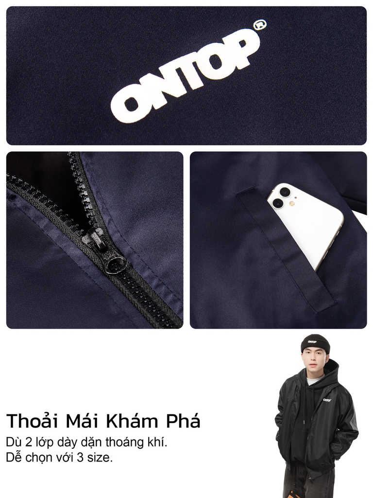 Logo ONTOP được in sắc nét ở mặt trước, nhỏ gọn nhưng đủ để thể hiện cá tính và chất riêng của thương hiệu. Đây chính là minh chứng rằng: áo khoác dù basic không cần quá nhiều chi tiết vẫn đủ để nổi bật giữa đám đông.