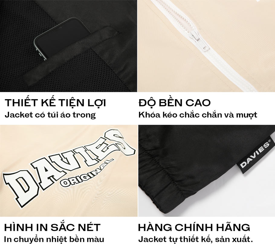 Ngoài ra, áo khoác local brand Davies được may kèm lớp lót dù Polyester mỏng nhằm tăng sự thoải mái khí hoạt động và thoáng khí.
