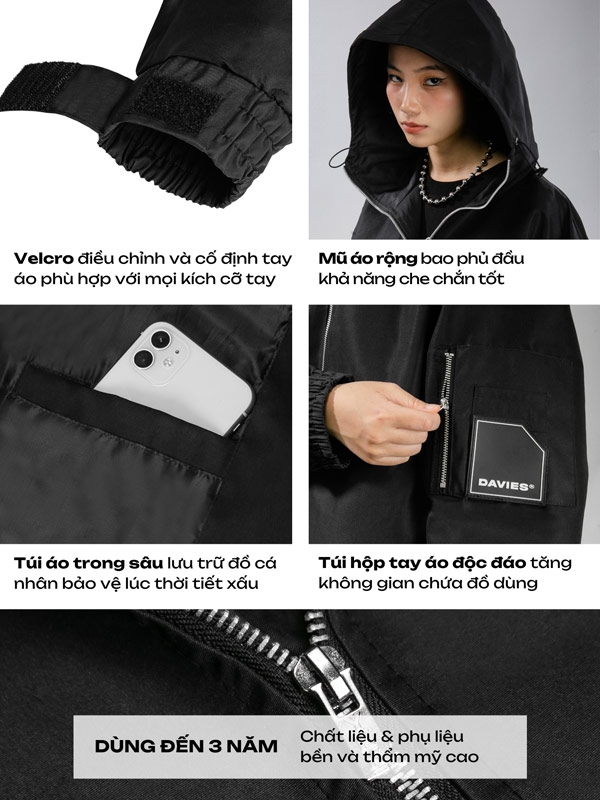 DAVIES hướng đến phong cách streetwear tuy cá tính năng động nhưng không kém phần thời thượng, nổi bật. Bung chất ở mọi sân chơi bởi jacket dù siêu dày dặn tạo form đứng cùng thiết kế basic dễ phối giúp bạn dễ dàng tạo ra nhiều phong cách đa dạng mà vẫn giữ được vẻ năng động và thời trang đường phố.