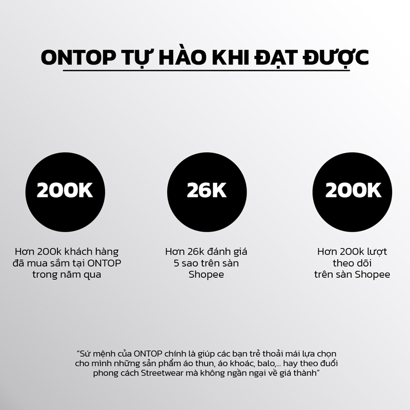 ONTOP được biết đến là một local brand với phong cách thời trang đường phố (streetwear). Các sản phẩm của ONTOP đều hướng tới các bạn trẻ là nam và nữ thích mang đồ local brand nhưng chưa biết cách phối đồ.