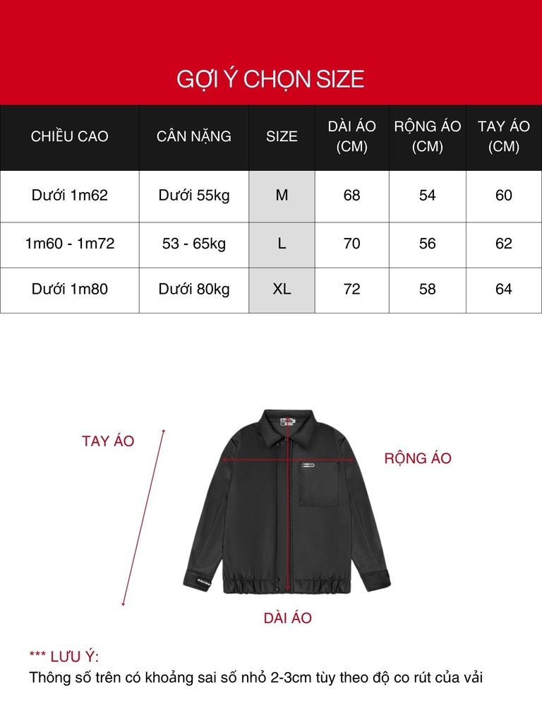 Lưu ý: Thông số có khoảng sai số nhỏ từ 2-3cm tuỳ vào độ co rút của vải. Đây cũng là thông số tổng trung bình cộng của hàng ngàn khách hàng trải nghiệm dòng sản phẩm jacket trước đó.