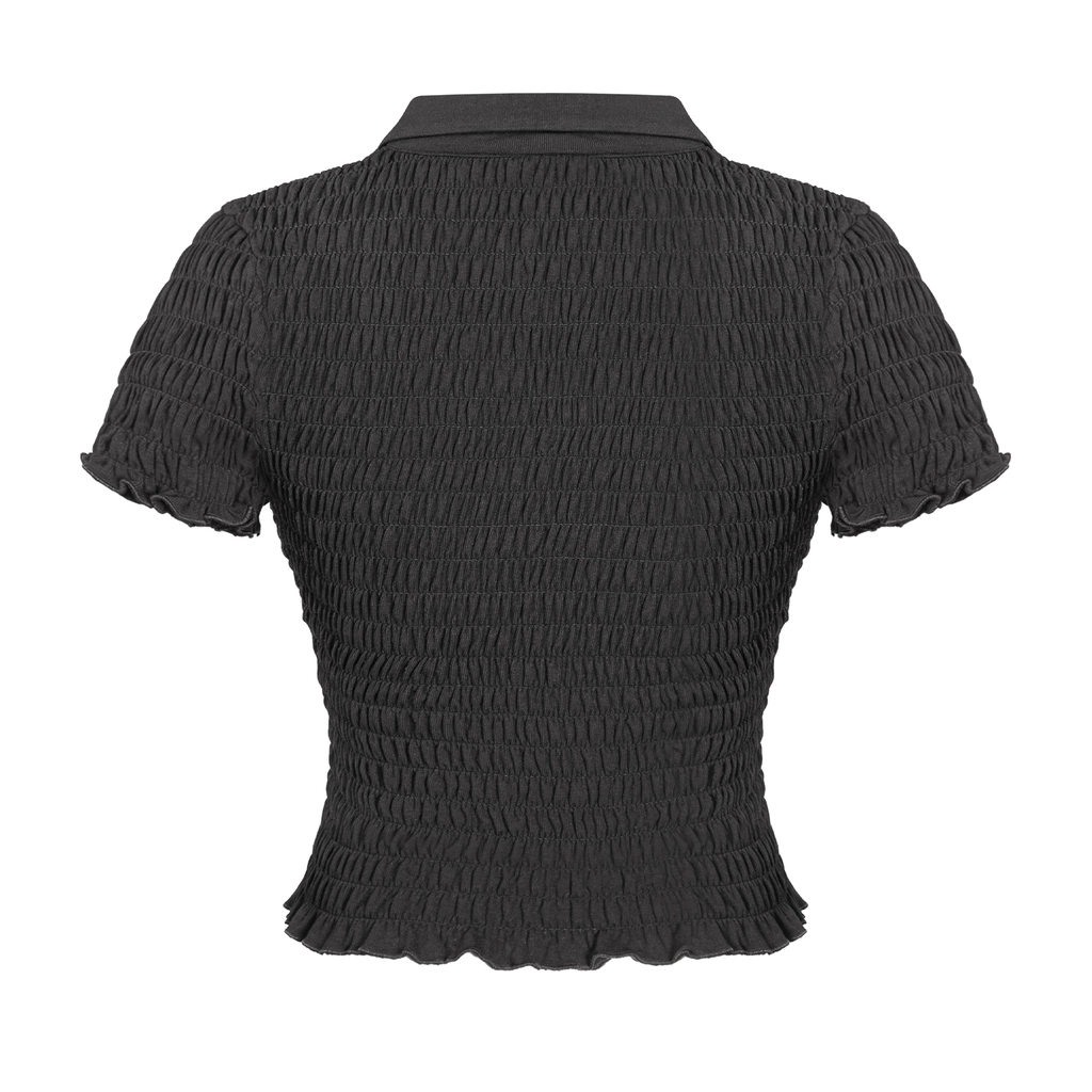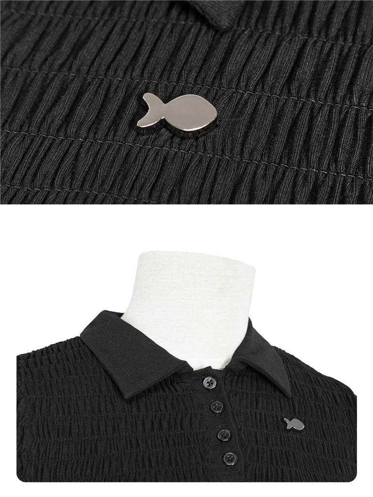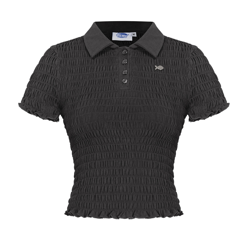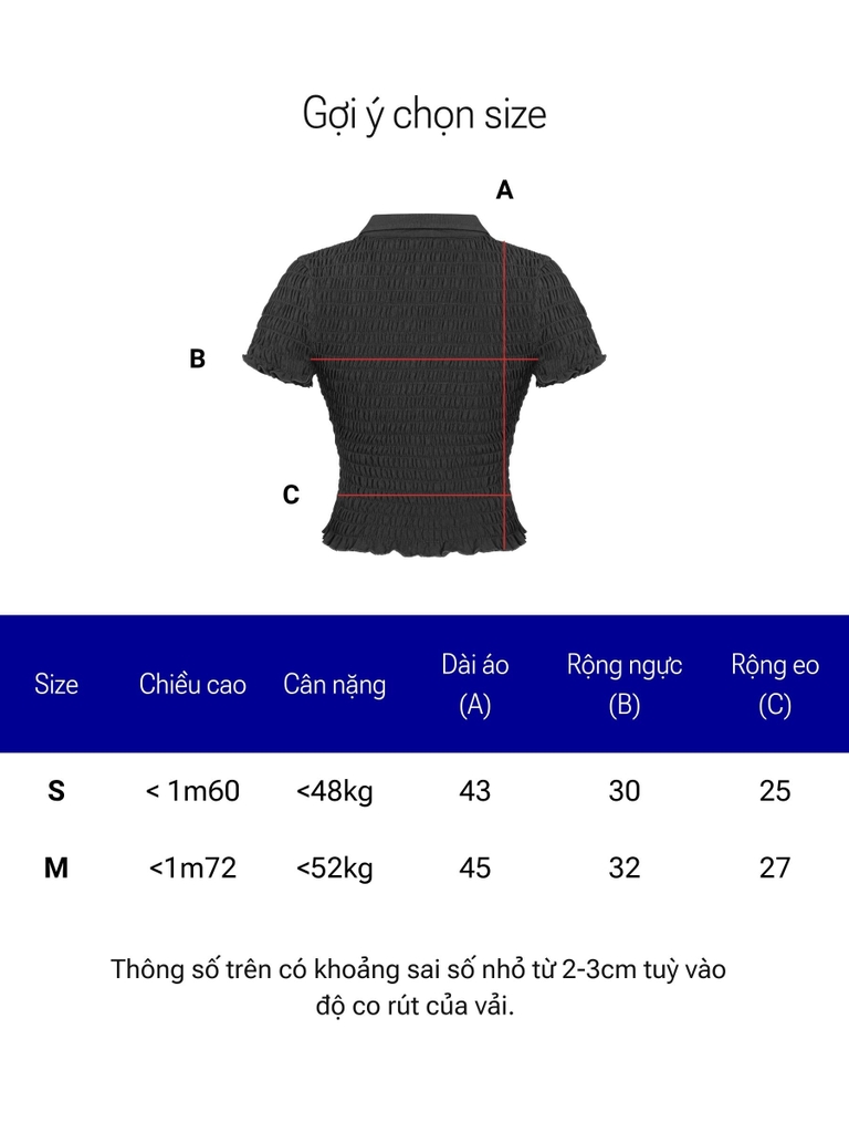Sự điệu đà được nhấn mạnh bằng chi tiết phối chun nhún thân mềm mại, tạo hiệu ứng thị giác đáng yêu và giúp áo ôm sát một cách tự nhiên. Áo được làm từ chất liệu thun rip lụa co giãn, mang lại cảm giác mềm mại và thoải mái khi mặc.