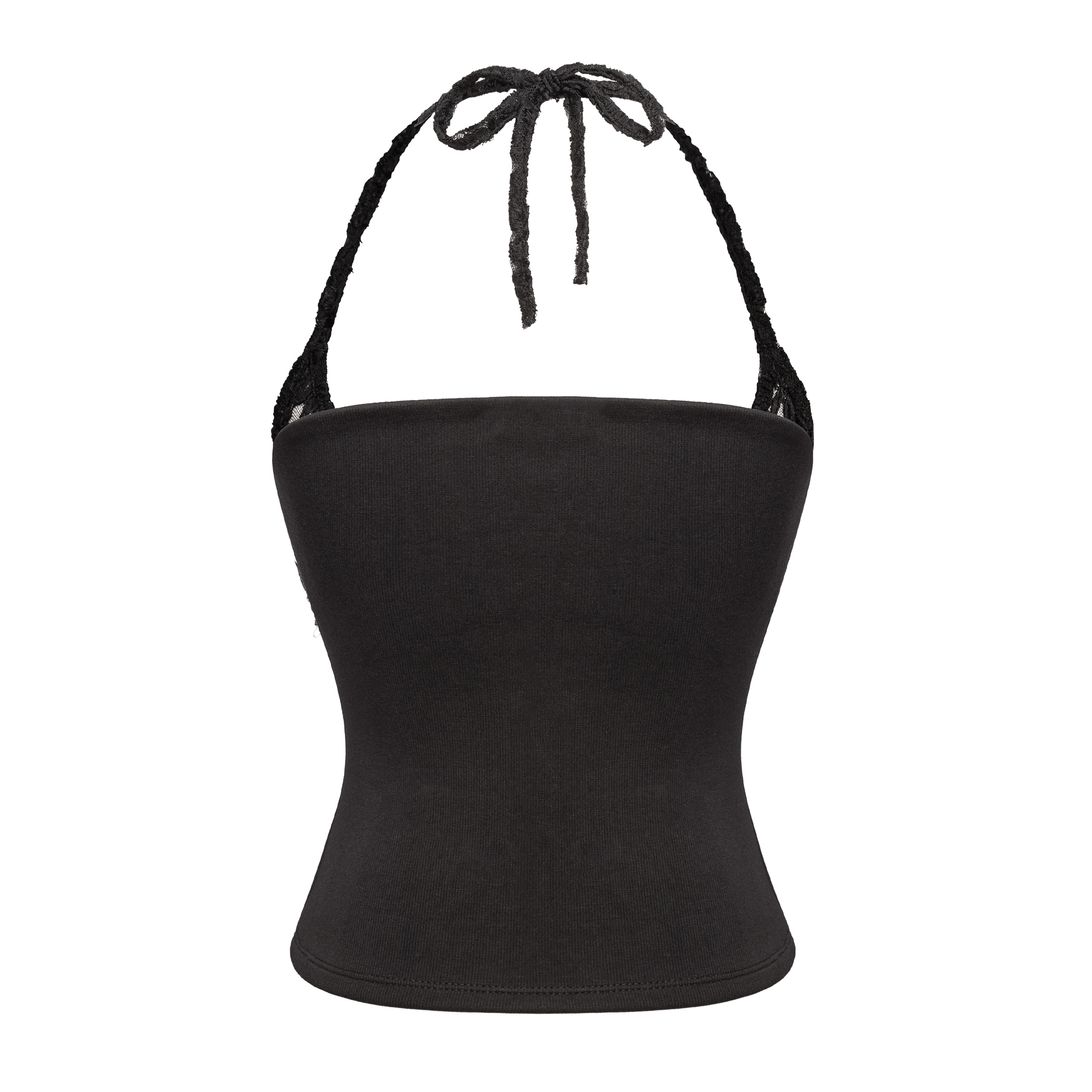 Áo ống có thiết kế khoét ngực táo bạo, phối cùng áo bra ren cổ yếm cột nơ đầy mê hoặc và logo inox đặc trưng của thương hiệu, giúp tôn lên vẻ đẹp quyến rũ và sang trọng của nàng.