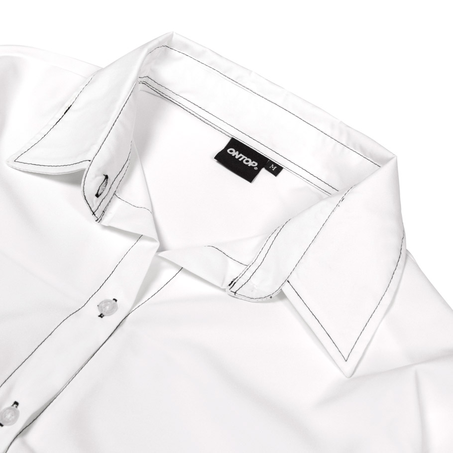 Thiết kế và màu sắc: áo sơ mi nam local với màu trắng trơn đơn giản nhưng không đơn điệu. Điểm nhấn là đường viền chỉ màu đen ở cổ áo, hàng nút và vạt áo. Với kiểu viền chỉ đen này, nó vừa tạo sự thu hút, vừa tôn rõ chất áo và sự mới lạ trong thiết kế. Phía trước ngực áo có túi ngoài cho bạn không gian đựng đồ thoải mái kèm logo ONTOP màu đen được thêu nổi tạo sự nổi bật. Áo sơ mi nam local có cổ chữ V, tay dài form rộng với mặt sau trơn nên bạn dễ kết hợp cùng các phụ kiện, trang phục khác.