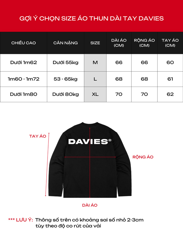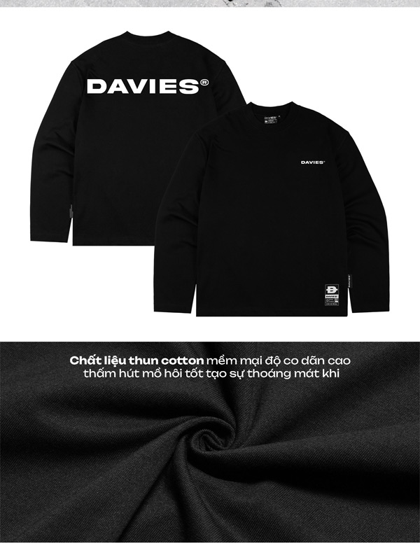 Áo thun tay dài in logo Davies được thiết kế với form rộng, giúp người mặc cảm thấy thoải mái và dễ dàng lựa chọn kích cỡ phù hợp với phong cách cá nhân. Với 3 size tiêu chuẩn (S, M, L), áo phù hợp với nhiều dáng người, từ vừa vặn đến thoải mái.