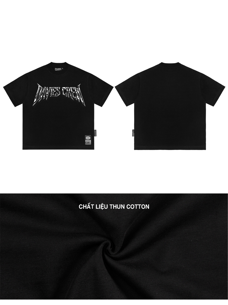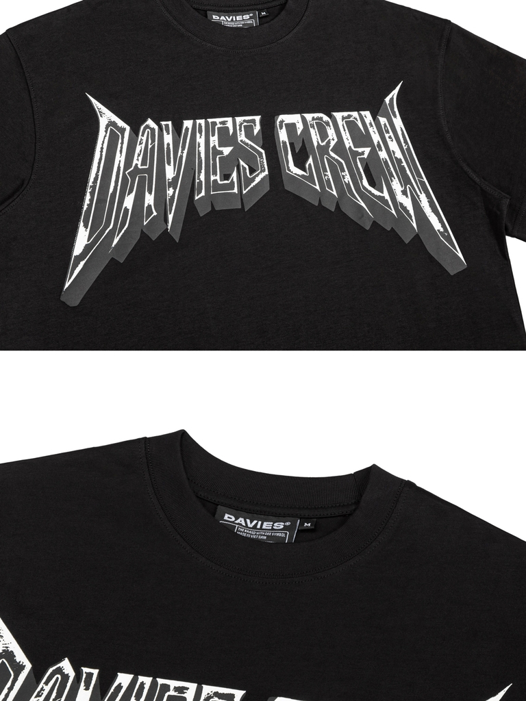 Điểm thu hút nhất chính là hình in chữ cách điệu mang hiệu ứng “metallic edge”. Từng nét chữ được tạo hình sắc, gai góc, mô phỏng bề mặt kim loại mài, cho cảm giác lạnh, mạnh và đầy năng lượng. Hiệu ứng đồ họa này được in lụa tách lớp, giúp bề mặt in nổi nhẹ và có chiều sâu – tạo nên dấu ấn thị giác khác biệt của DAVIES.