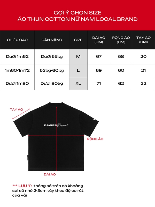 Davies mang đến bạn mẫu áo thun form rộng với kiểu dáng thoải mái cùng 3 size tiêu chuẩn giúp bạn dễ dàng lựa chọn trang phục phù hợp, khẳng định cá tính riêng biệt.