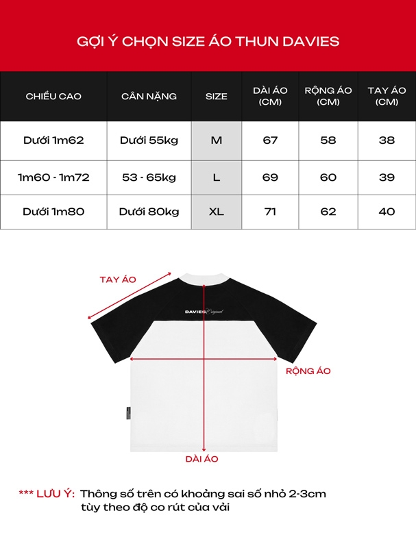 Mỗi áo thun raglan nam nữ từ Davies được thiết kế để vừa vặn với mọi hình dáng cơ thể, từ M đến XL, giúp phô diễn phong cách cá nhân một cách tối ưu.