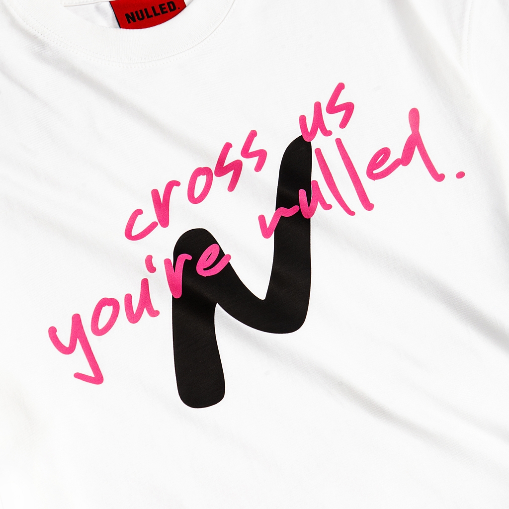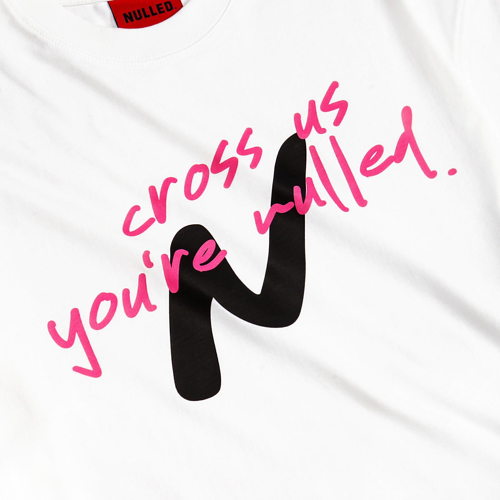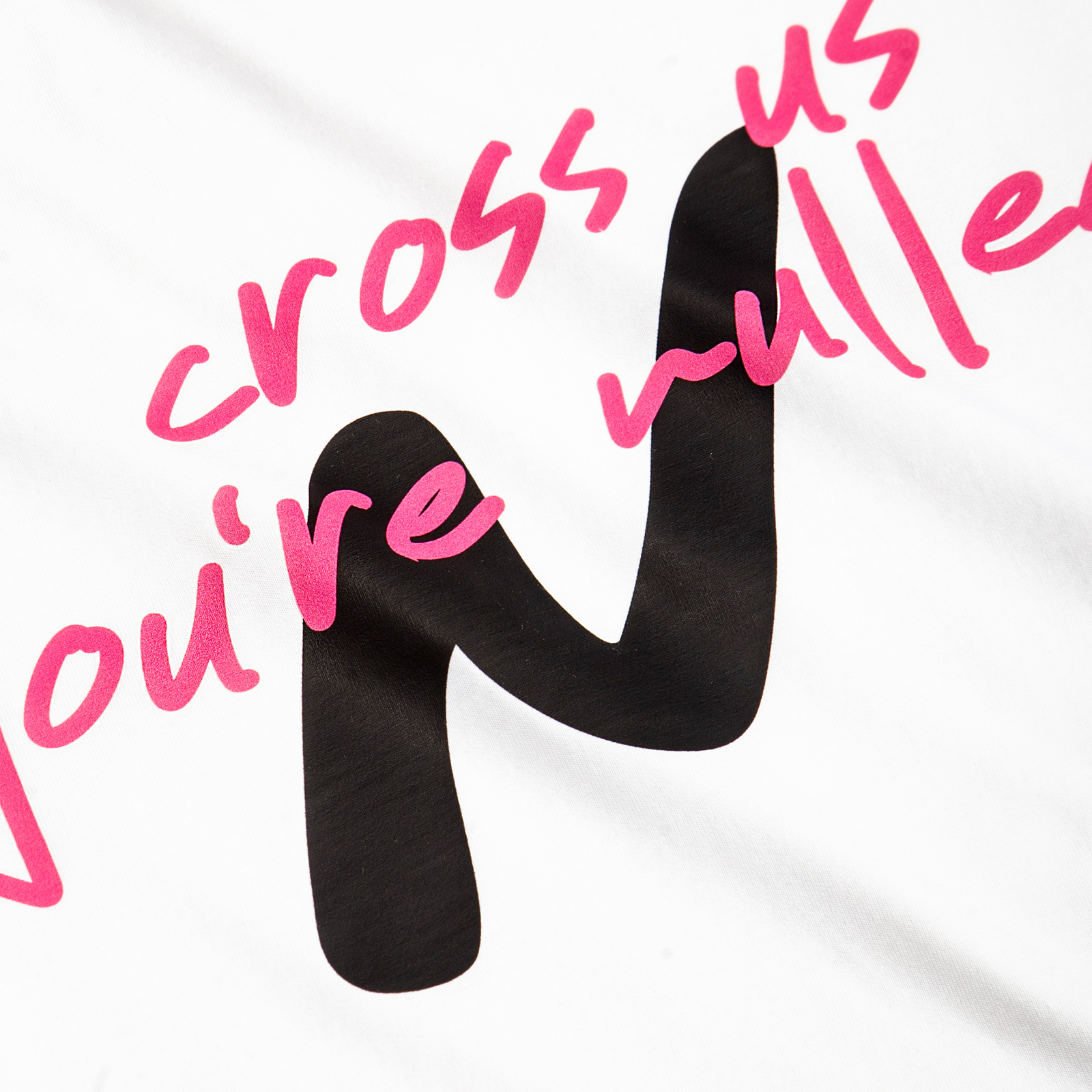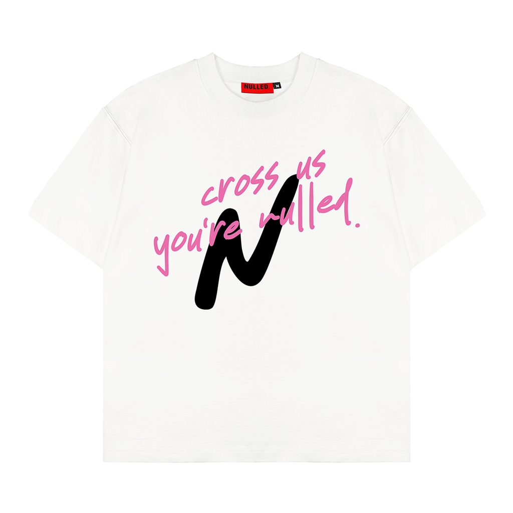 Thiết kế: Form cổ tròn basic, dễ mặc, unisex. Điểm nhấn nằm ở mặt trước với chữ nghiêng hồng "cross us you’re nulled" và chữ "N" màu đen nổi bật, tạo sự cân bằng giữa tối giản và cá tính.