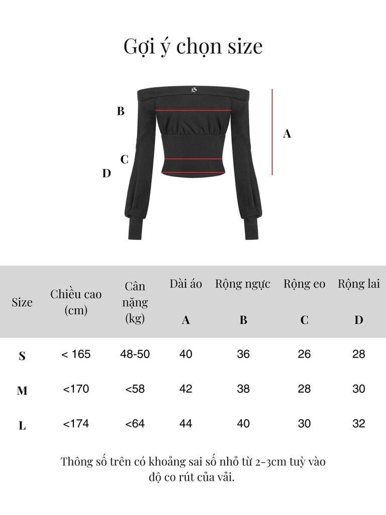 Cổ trễ vai gợi cảm khoe trọn xương quai xanh, kết hợp tay dài phồng nhẹ và bo thun ở cổ tay tạo sự duyên dáng, nữ tính. Phần lưng áo có chi tiết xẻ nhỏ đầy bí ẩn và lưu luyến.