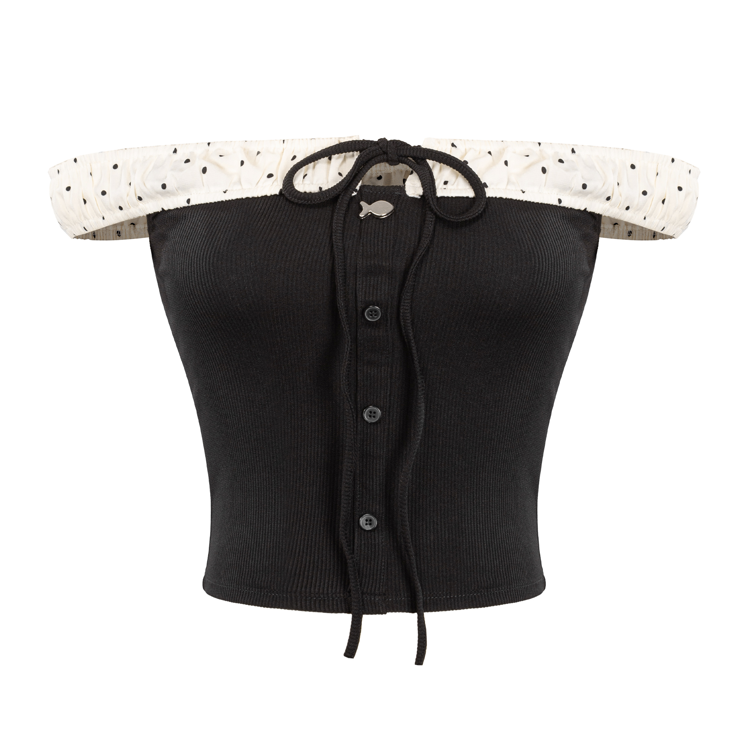 Jethro Top nổi bật với kiểu dáng trễ vai nhẹ nhàng, khéo léo khoe bờ vai nhỏ xinh, kết hợp cùng tay ngắn phồng nhẹ tạo nên sự thoải mái và nét điệu đà. Điểm nhấn ngọt ngào là chiếc nơ xinh xắn được thắt duyên dáng, cùng hàng cúc áo được phối tỉ mỉ, không chỉ làm tăng thêm vẻ đáng yêu mà còn tạo nên một tổng thể hài hòa, cổ điển mà vẫn rất hiện đại.