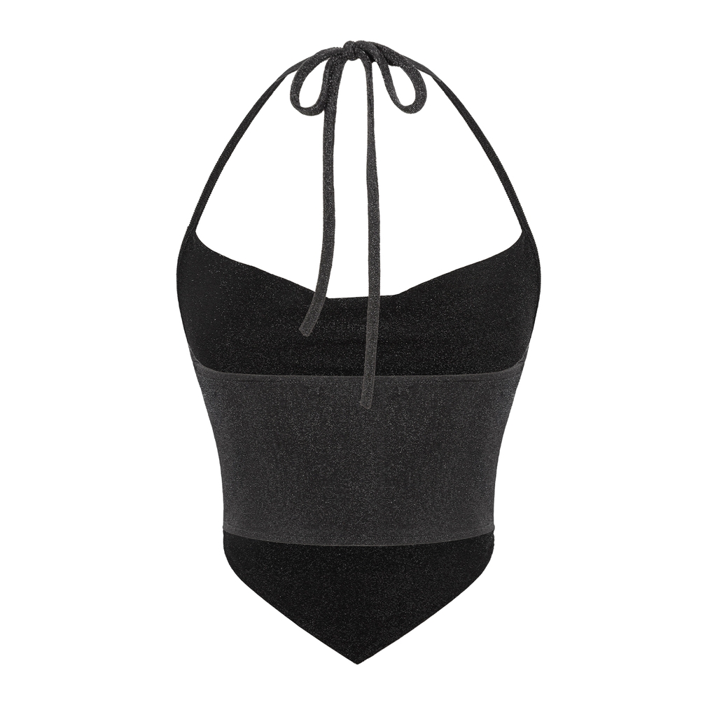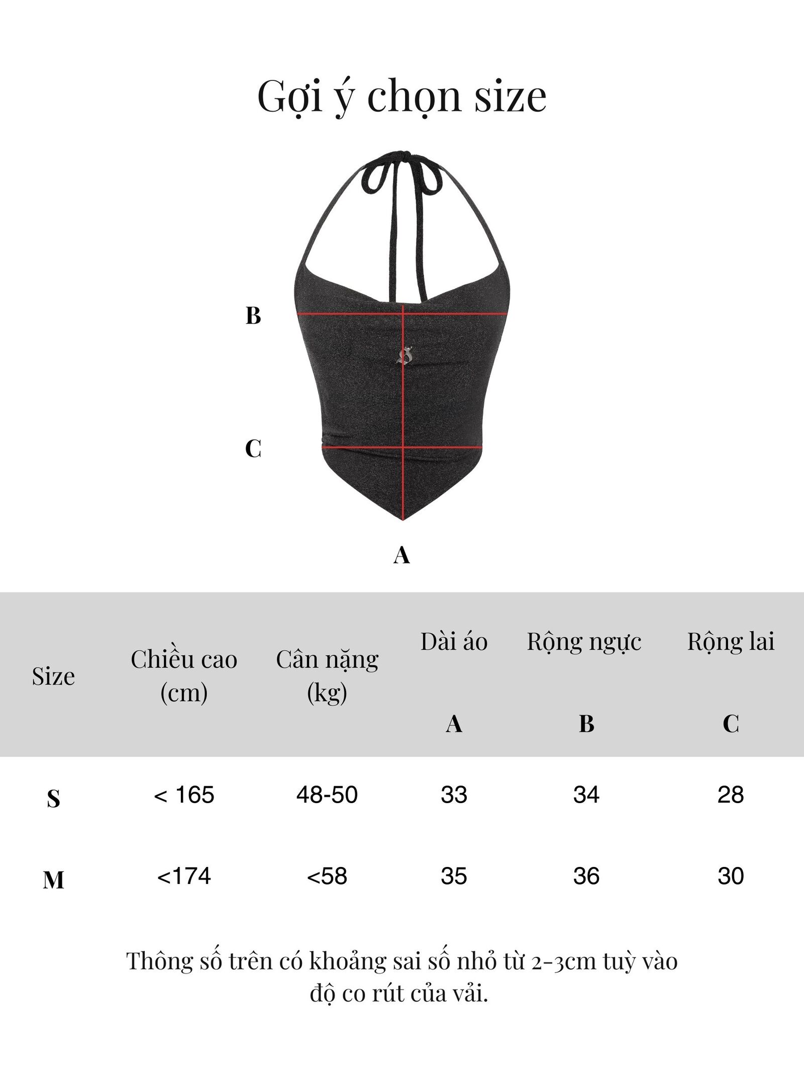Áo yếm có thiết kế cổ đổ quyến rũ, cột dây cổ điều chỉnh dễ dàng, hở lưng khoe trọn bờ vai quyến rũ. Logo inox khắc sắc nét ở vị trí trung tâm, đường may gọn gàng giữ phom.