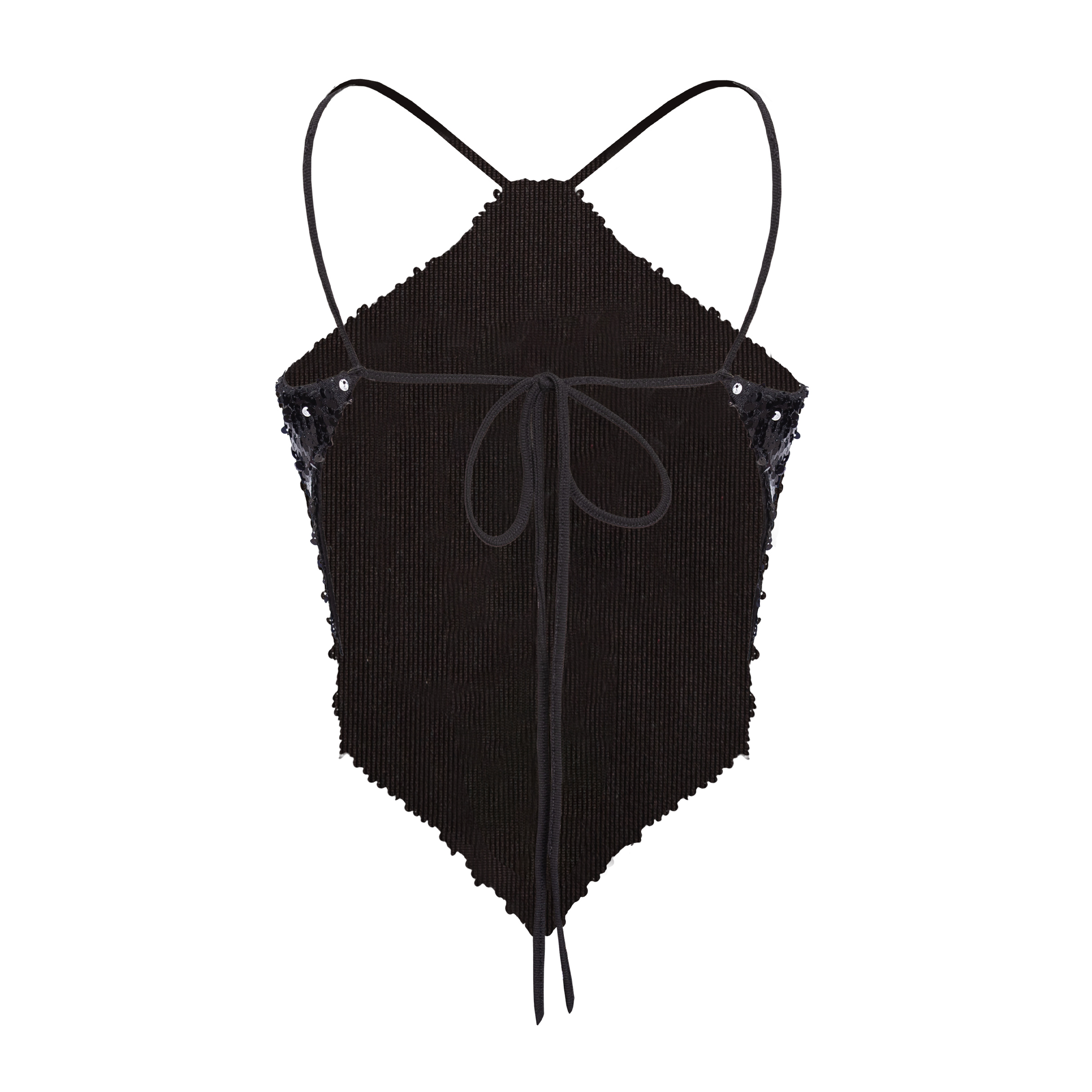 Áo yếm nổi bật với thiết kế yếm hở lưng táo bạo kết hợp chi tiết cột dây giúp điều chỉnh ôm dáng linh hoạt, khoe trọn bờ vai và tấm lưng quyến rũ, logo inox tinh xảo tạo điểm nhấn sang trọng.