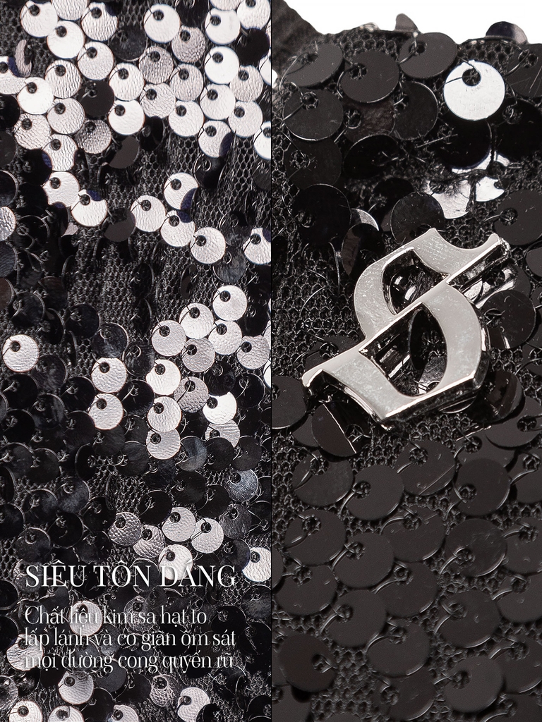 Chất liệu kim sa hạt to lấp lánh cuốn hút bên ngoài cùng thun sọc nhí mềm mại bên trong, ôm trọn đường cong cơ thể.