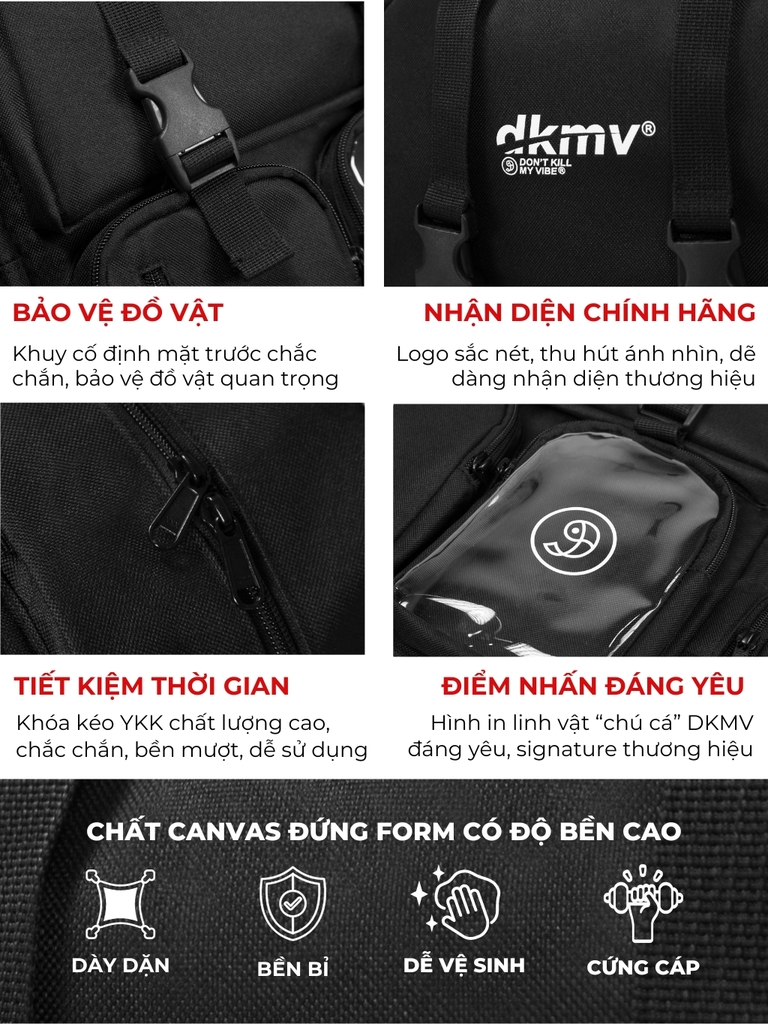 - Giúp đảm bảo được độ bền bỉ trong quá trình sử dụng, DKMV đã cân nhắc đưa ra chất liệu canvas phù hợp với hành vi sử dụng của giới trẻ hiện nay. Với khả năng chống nước nhẹ cùng nhiều ngăn tiện ích, giúp bạn lưa trử lượng lượng các dụng cụ học tập như: Laptop, sách, vở, ....hay dùng để đi du lịch cực kỳ phù hợp.