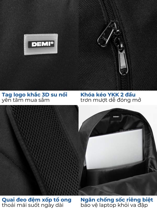 Balo DEMI có nhiều ngăn chứa rộng rãi, giúp bạn sắp xếp đồ đạc một cách khoa học. Balo có ngăn đựng laptop riêng biệt, bảo vệ laptop của bạn an toàn. Có quai đeo và đệm lưng được thiết kế êm ái, giúp bạn thoải mái khi đeo balo trong thời gian dài.