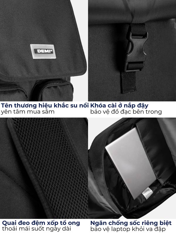 Khóa bấm ở nắp đậy chắc chắn giúp bảo vệ tuyệt đối cho balo.