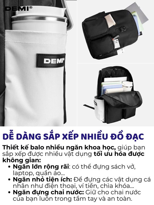 Sản phẩm balo canvas của DEMI khác biệt với nhiều balo khác ở chi tiết nhiều ngăn phụ nhỏ. Đây là một chi tiết nhỏ nhưng mang lại rất nhiều tiện lợi khi sử dụng. Với nhiều ngăn phụ, bạn có thể tối ưu được không gian có thể mang sách vở và laptop một cách dễ dàng.