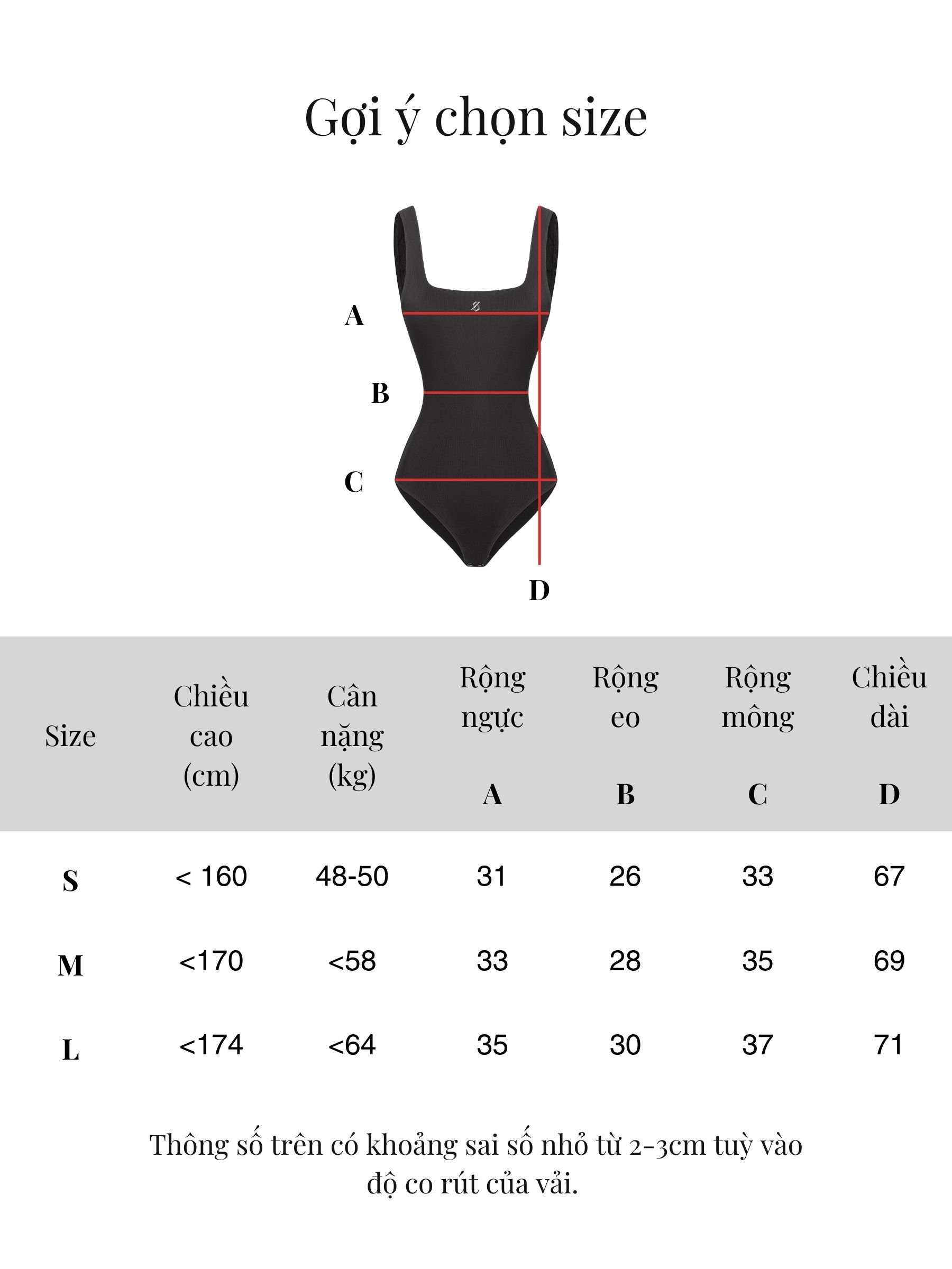 | Size | Rộng ngực | Rộng eo | Rộng mông | Chiều dài tổng |
