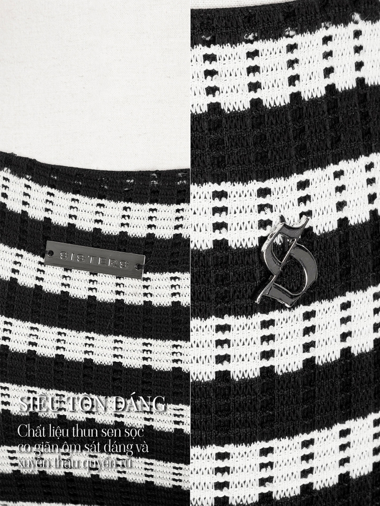Đính kèm logo inox chữ S đặc trưng và tag inox sang chảnh, tạo nên sự khác biệt và nổi bật cho chiếc váy.