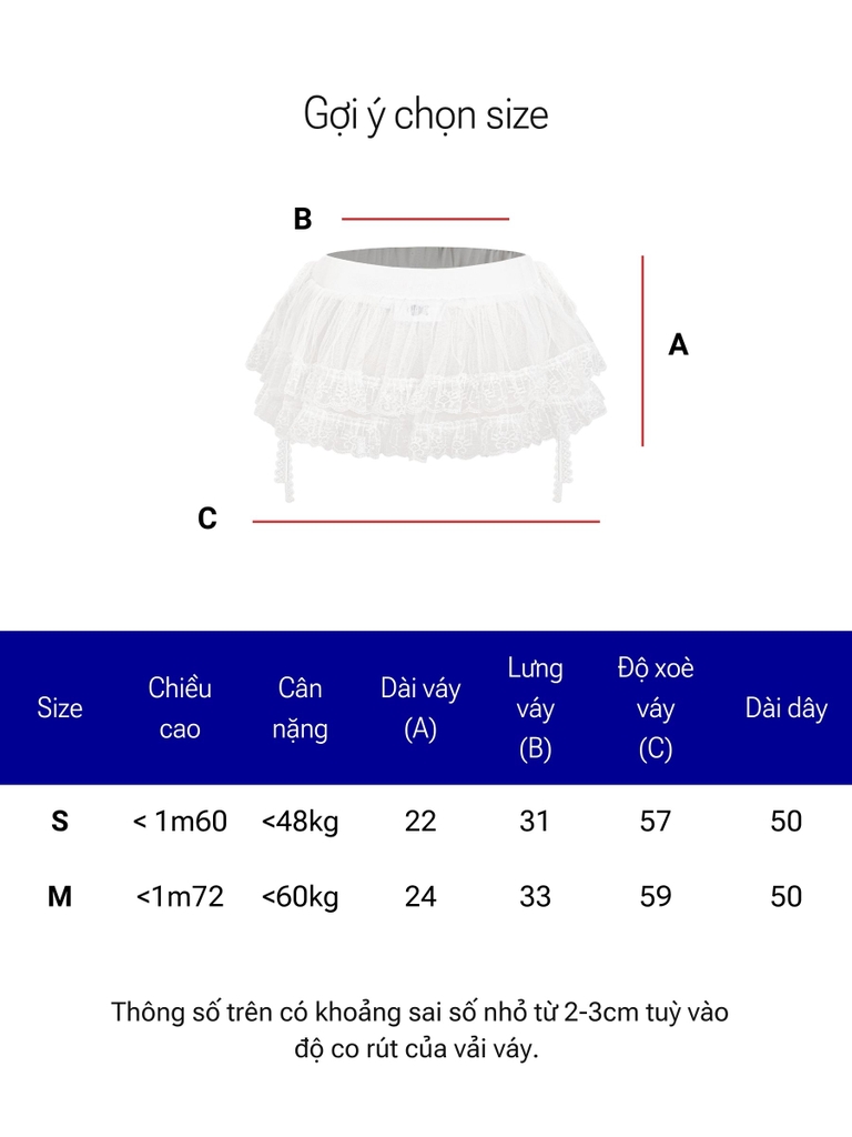 | Size | Dài váy | Lưng váy | Xòe váy | Dài dây |
