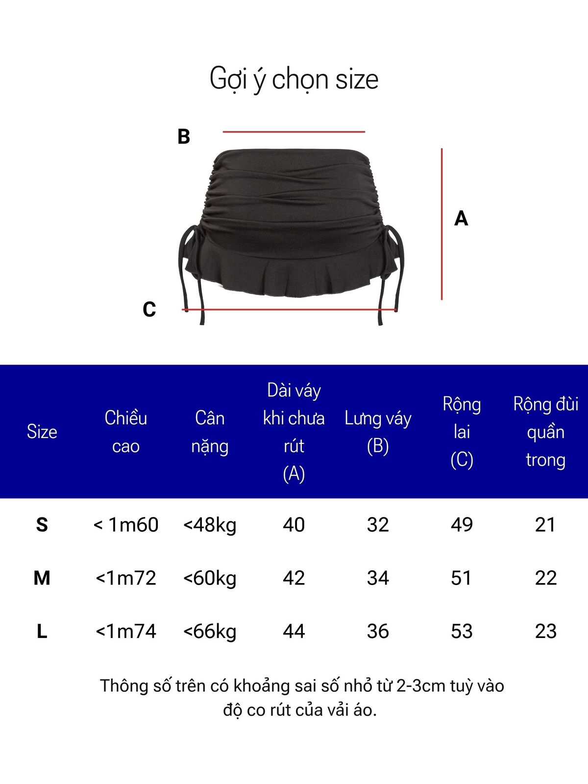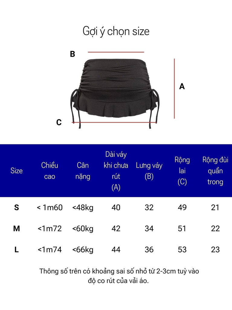 | Size | Dài Váy | Rộng lưng | Rộng vòng váy |