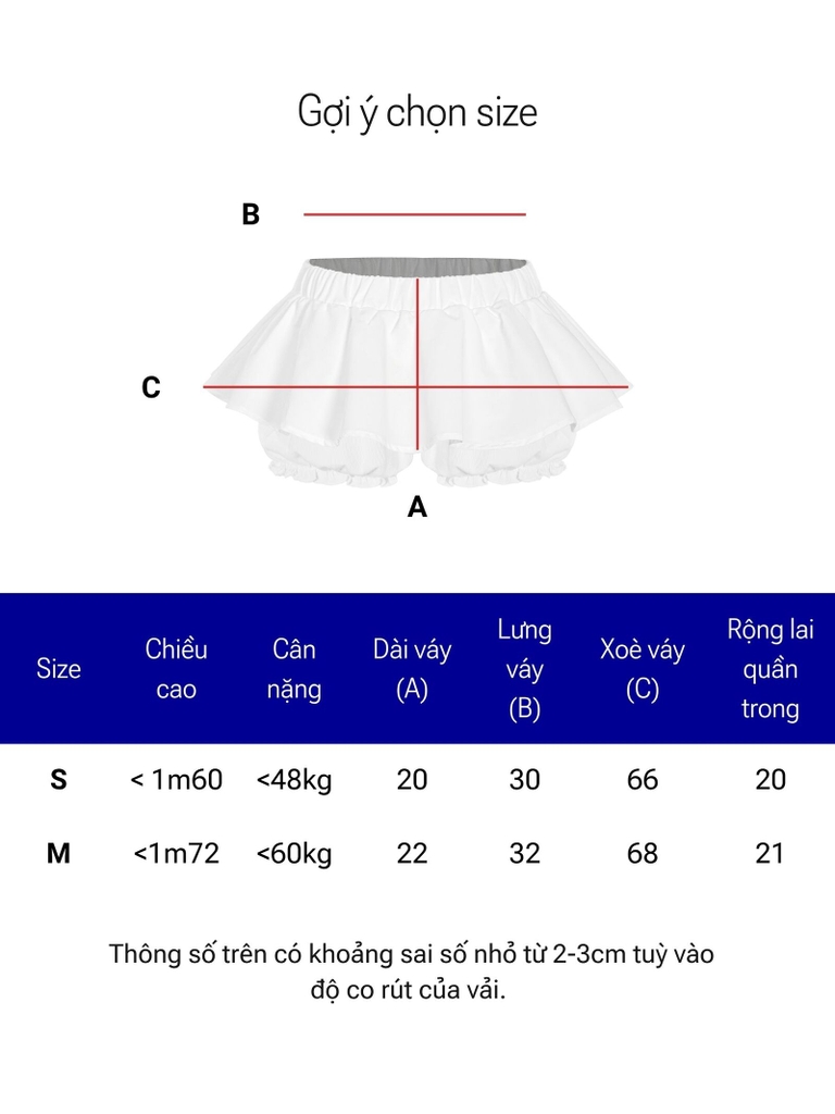 | Size | Dài váy | Rộng lưng | Xoè váy | Rộng lai quần trong |