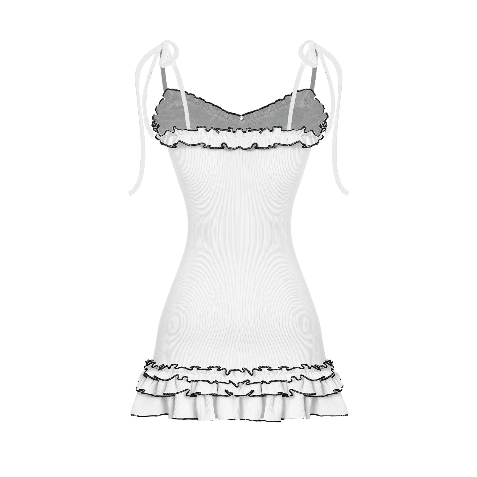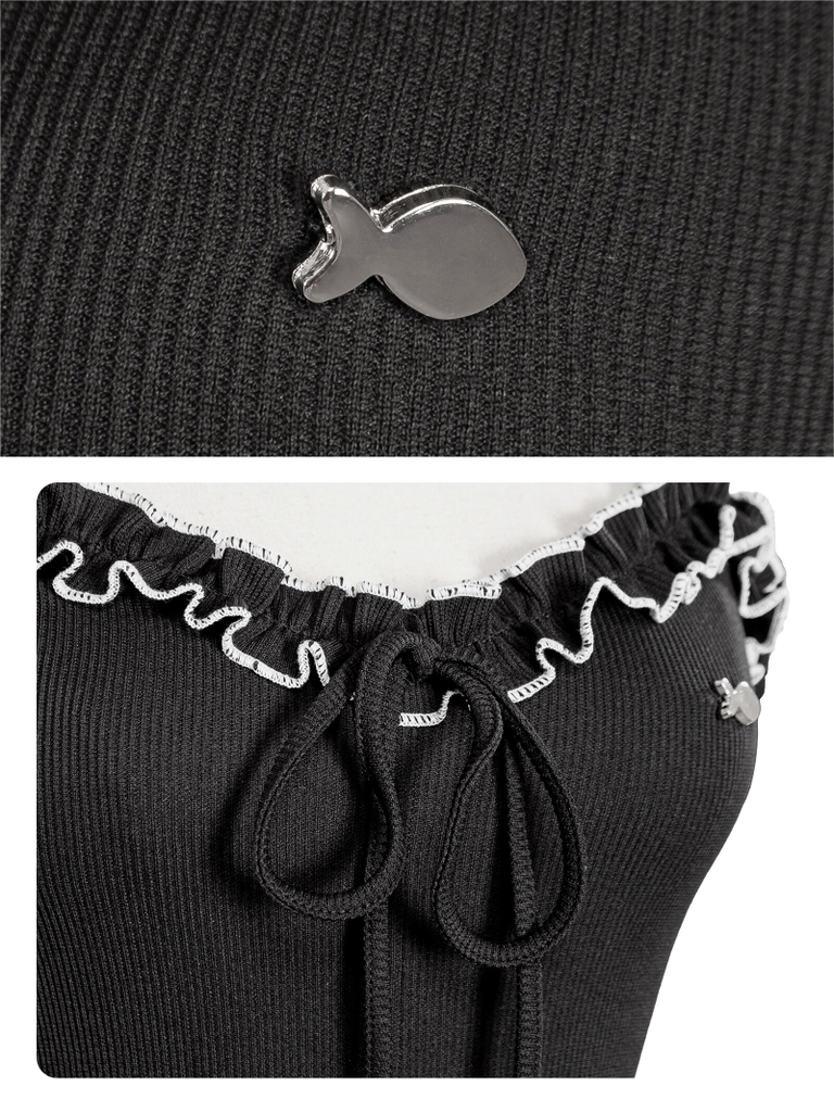 Thiết kế hai dây mảnh dẻ, dây cột tinh tế cùng chi tiết cúp ngực khéo léo giúp bé khoe trọn bờ vai. Điểm nhấn tạo sự lãng mạn là phần phối bèo nhẹ nhàng, kết hợp cùng chi tiết viền tương phản nổi bật, tạo hiệu ứng thị giác sắc nét, đầy phong cách.