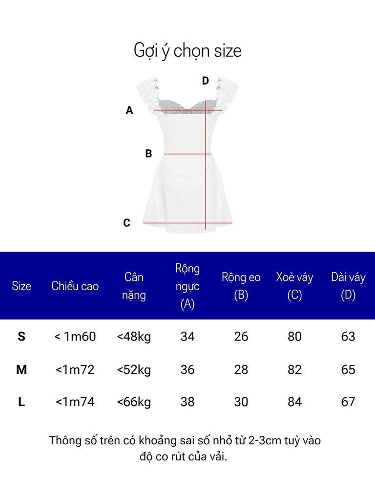 | Size | Rộng ngực | Rộng eo | Xoè váy | Dài váy |