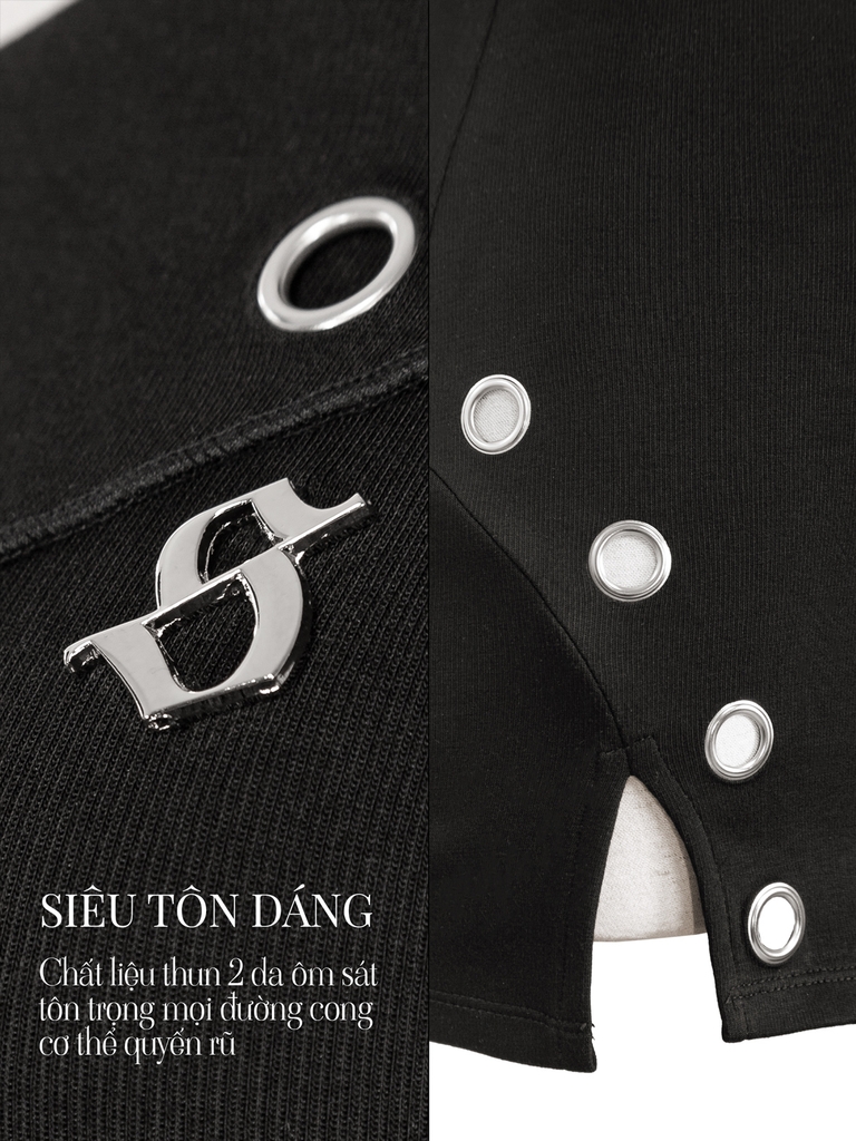 Đầm body có hoạ tiết phối khoen kim loại tinh xảo chạy dọc phần xẻ tà mang lại nét phá cách hiện đại, cùng phần lai lật độc đáo tạo điểm nhấn cuốn hút.