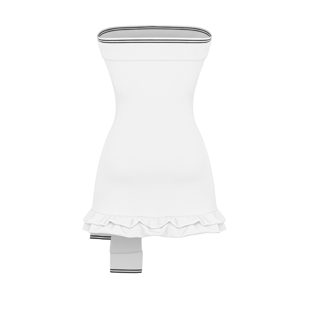 Sắc trắng rạng ngời làm chủ đạo, được điểm tô bằng đường viền đen mảnh mai, tạo nên sự tương phản hài hòa và tinh tế. Thiết kế cúp ngực duyên dáng ôm lấy thân trên, khoe bờ vai mềm mại một cách ngọt ngào.