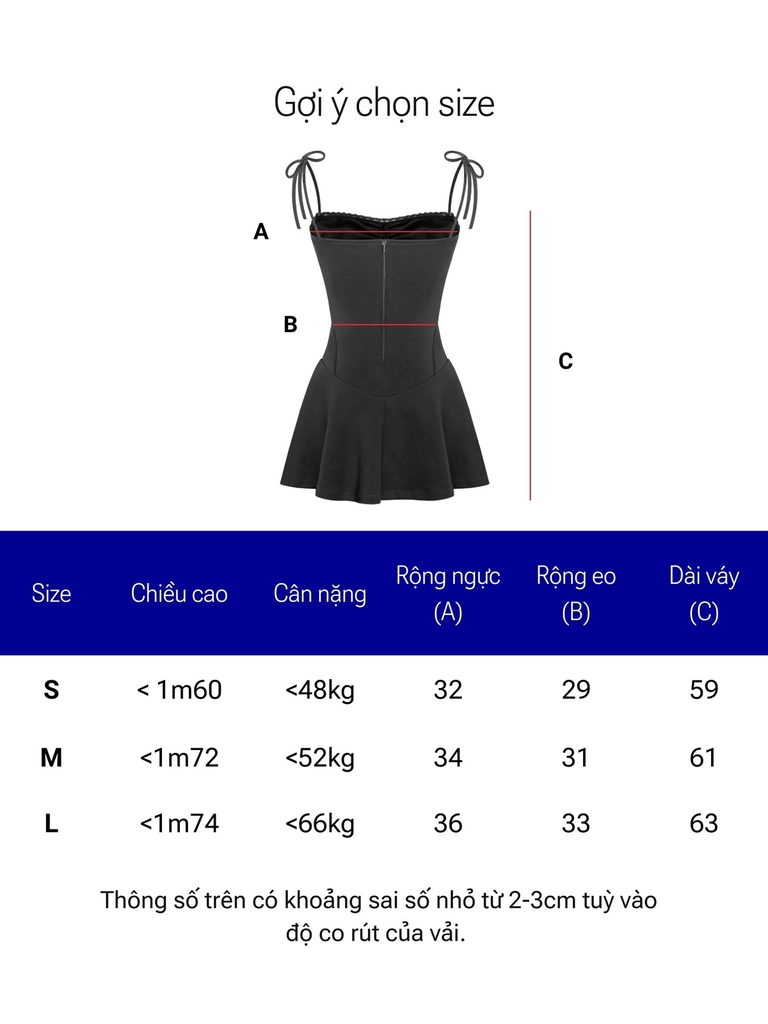 | Size | Dài đầm | Rộng ngực | Rộng eo | Rộng lai quần |