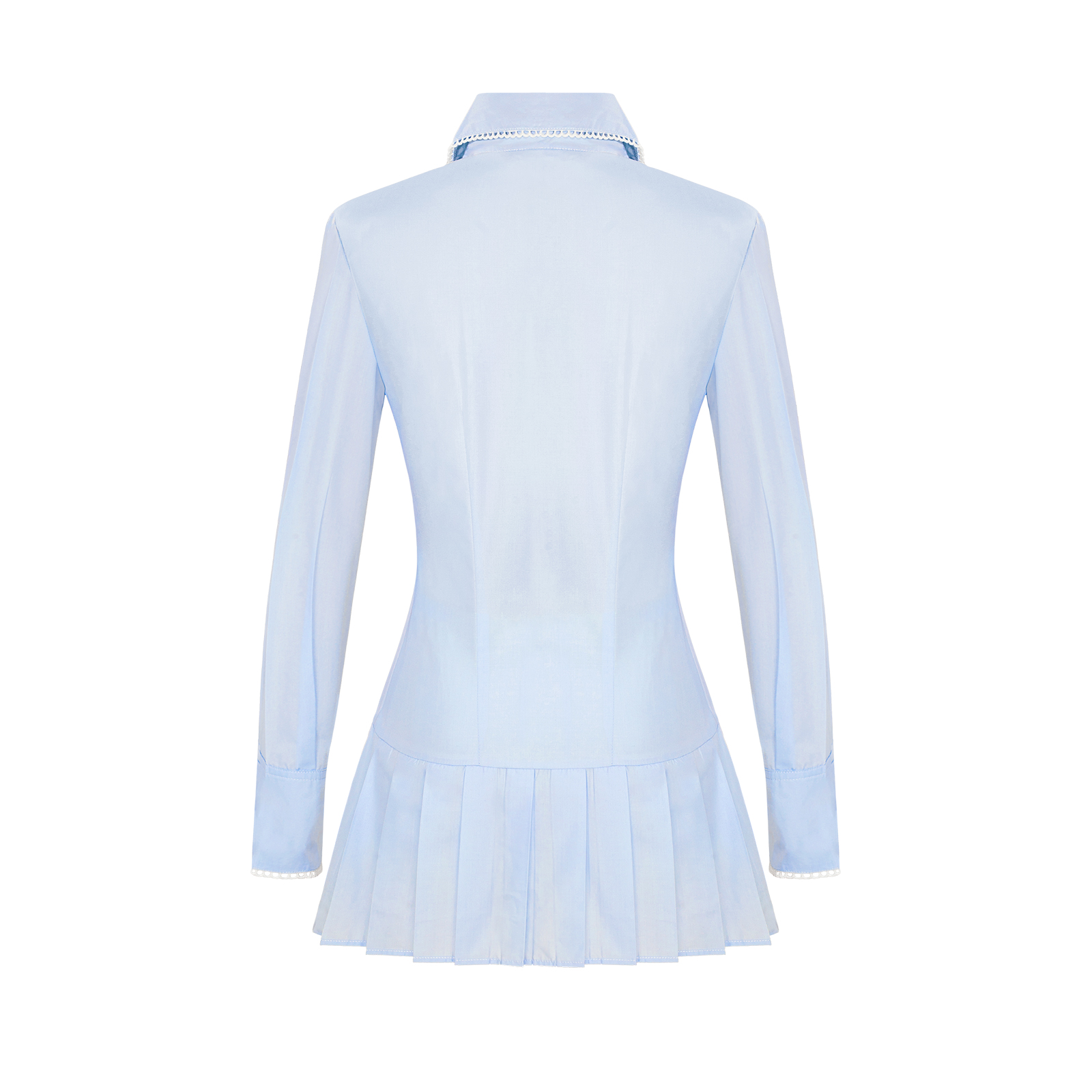 Chiếc đầm gây ấn tượng với kiểu cổ polo cổ điển, kết hợp cùng chi tiết tay dài trang nhã. Dáng váy xếp ly nhẹ nhàng tạo nên độ bồng bềnh duyên dáng, và hoạ tiết phối ren mỏng manh, tinh xảo, tạo cảm giác e ấp và vô cùng nữ tính.