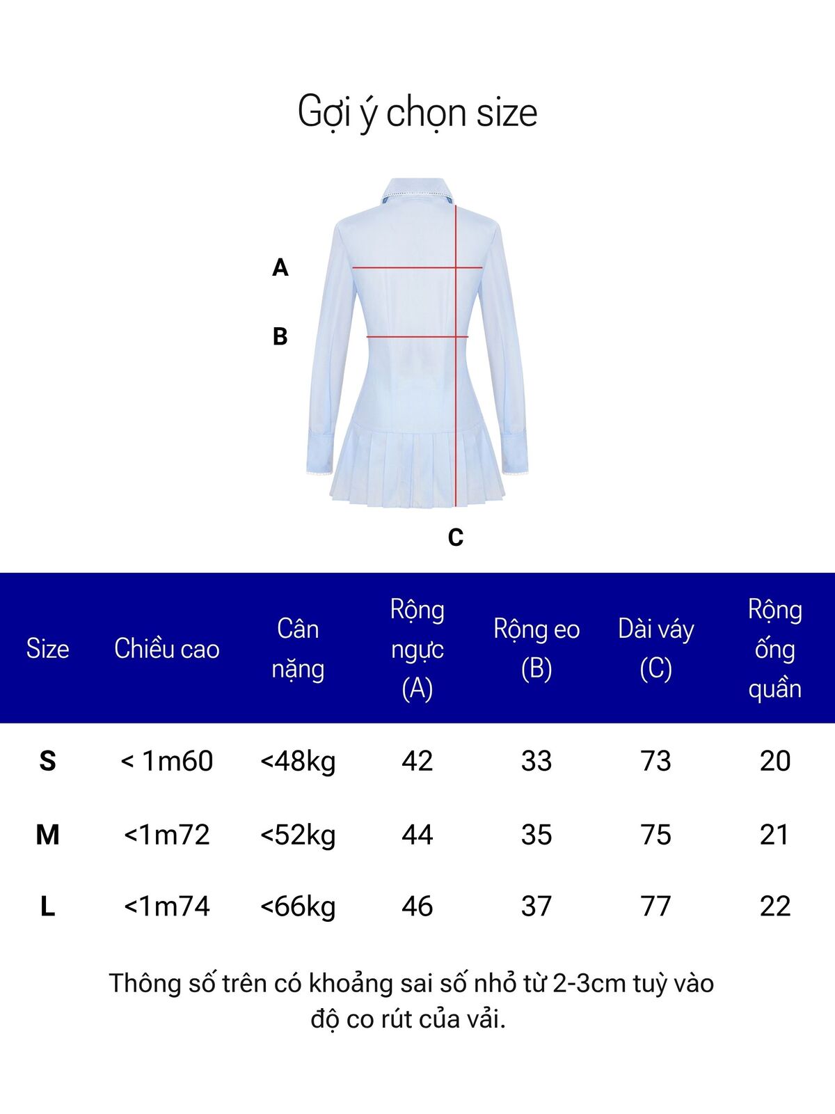 | Size | Rộng ngực | Rộng eo | Dài váy | Rộng ống quần |