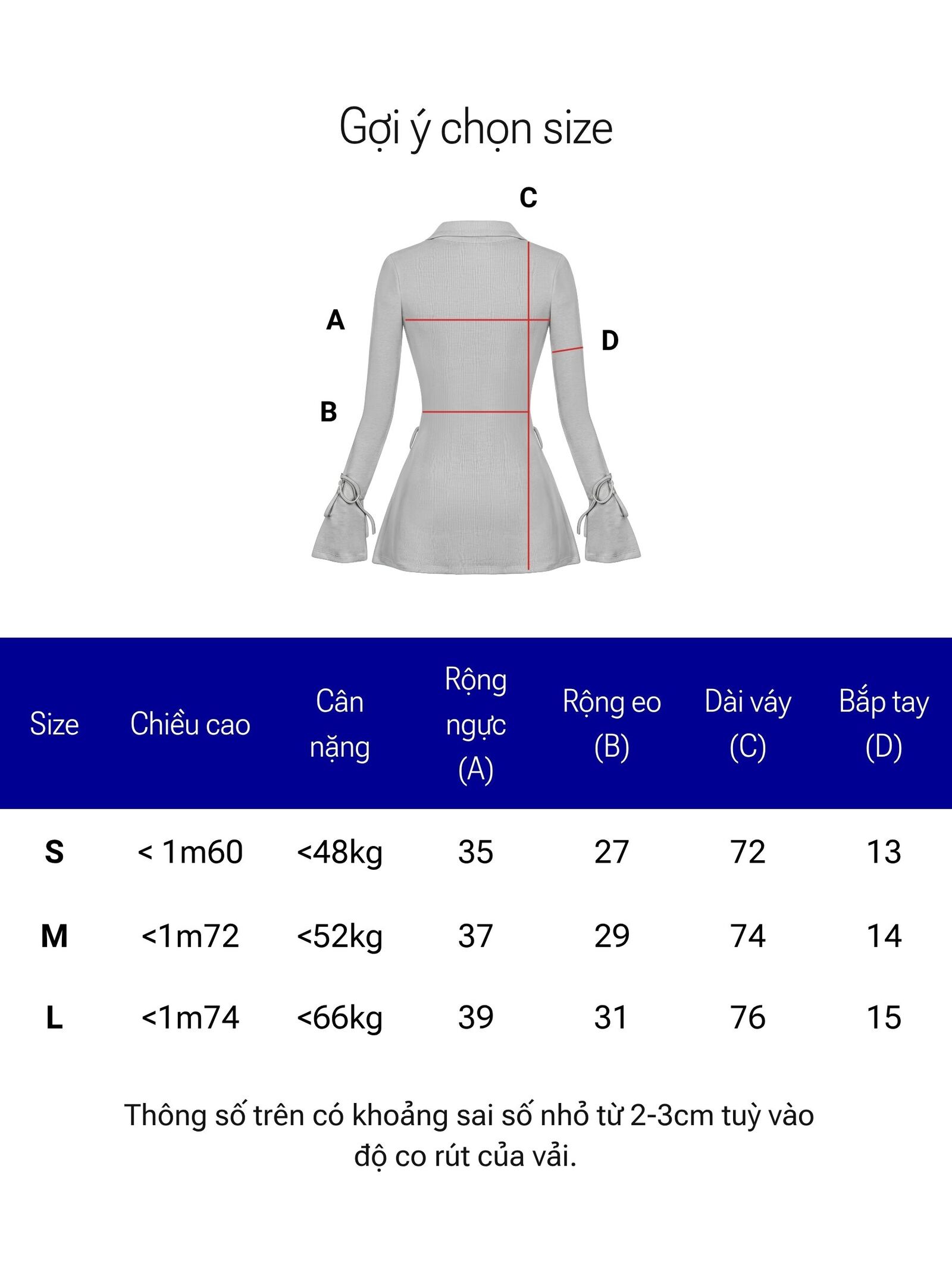| Size | Rộng ngực | Rộng eo | Dài váy | Rộng bắp tay |