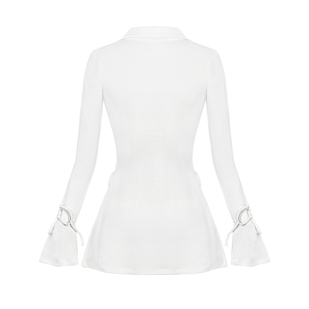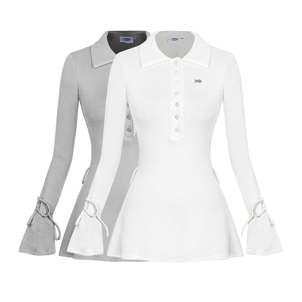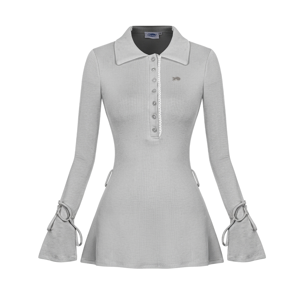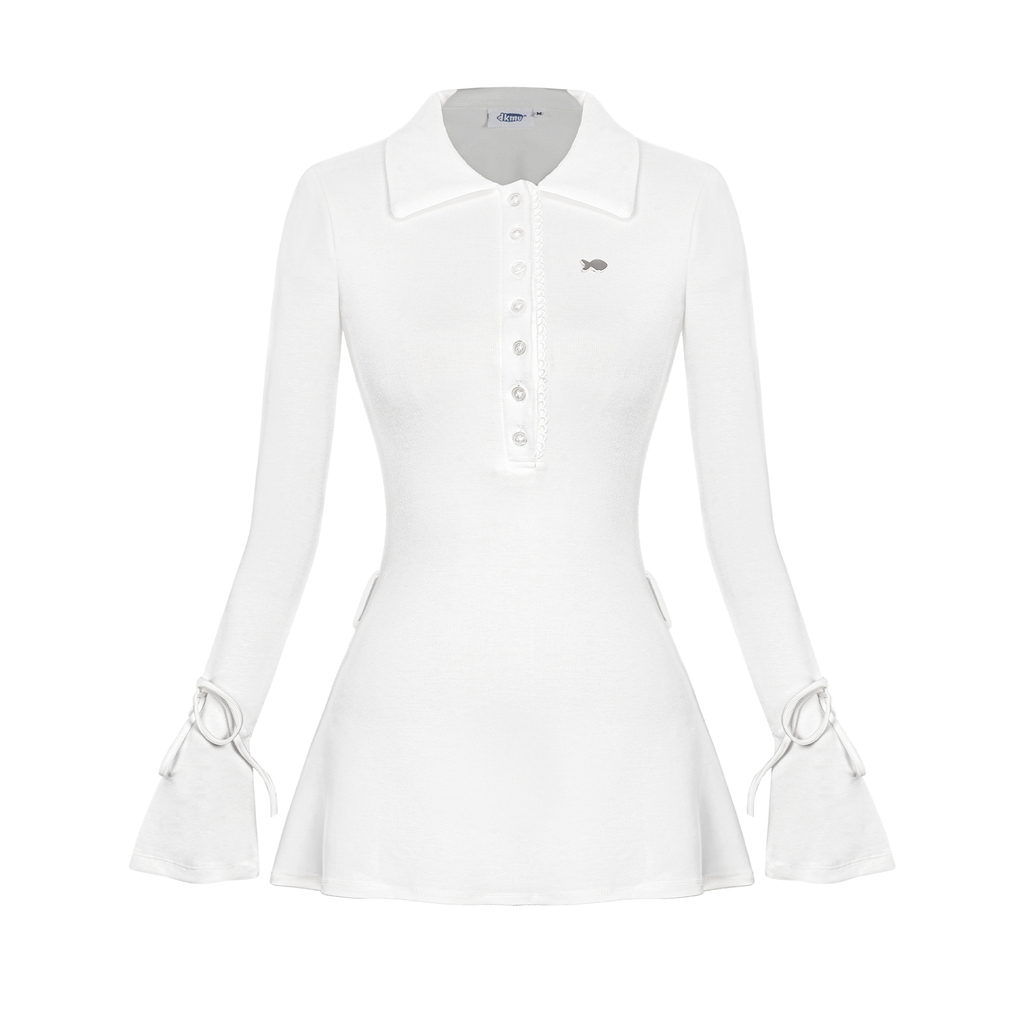 Jina Dress gây ấn tượng với kiểu dáng cổ polo cổ điển, kết hợp chi tiết cài nút duyên dáng được tô điểm bằng viền ren mỏng. Sự khác biệt nằm ở phần tay áo loe mềm mại, thắt dây nơ điệu nghệ, mang đến nét nữ tính, e ấp đầy cuốn hút.