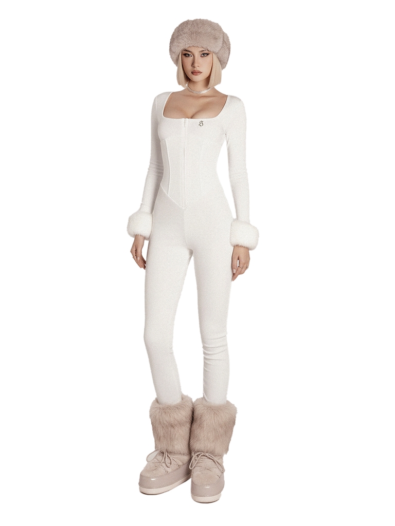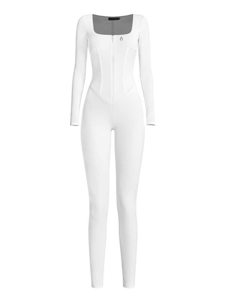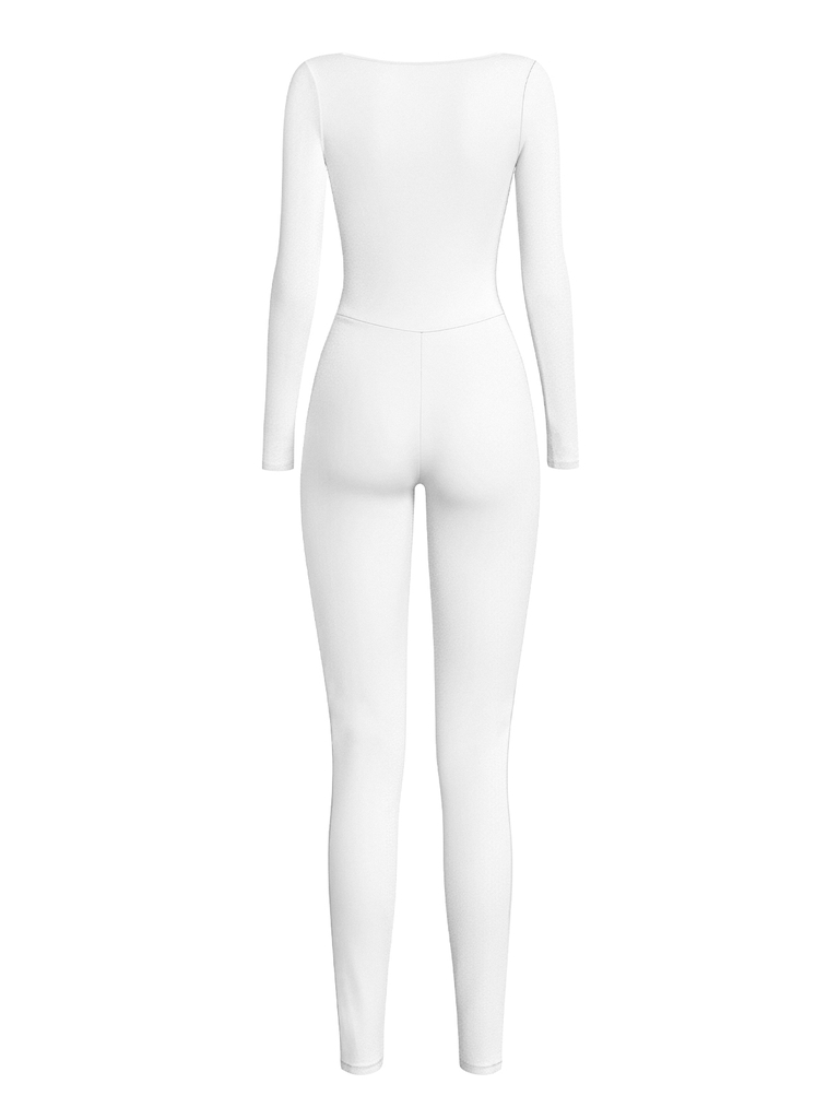 Jumpsuit có dáng cổ vuông tay dài ôm sát cơ thể, tạo hiệu ứng thon gọn và tôn đường cong.