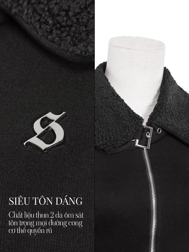 Cổ áo phối lông cừu trắng kem tinh tế, tạo cảm giác mềm mại, ấm áp và đẳng cấp, phù hợp cho mọi sự kiện nổi bật. Thiết kế có khoá và dây khóa đóng mắt cáo, kết hợp cùng khóa kéo kim loại giữa áo.