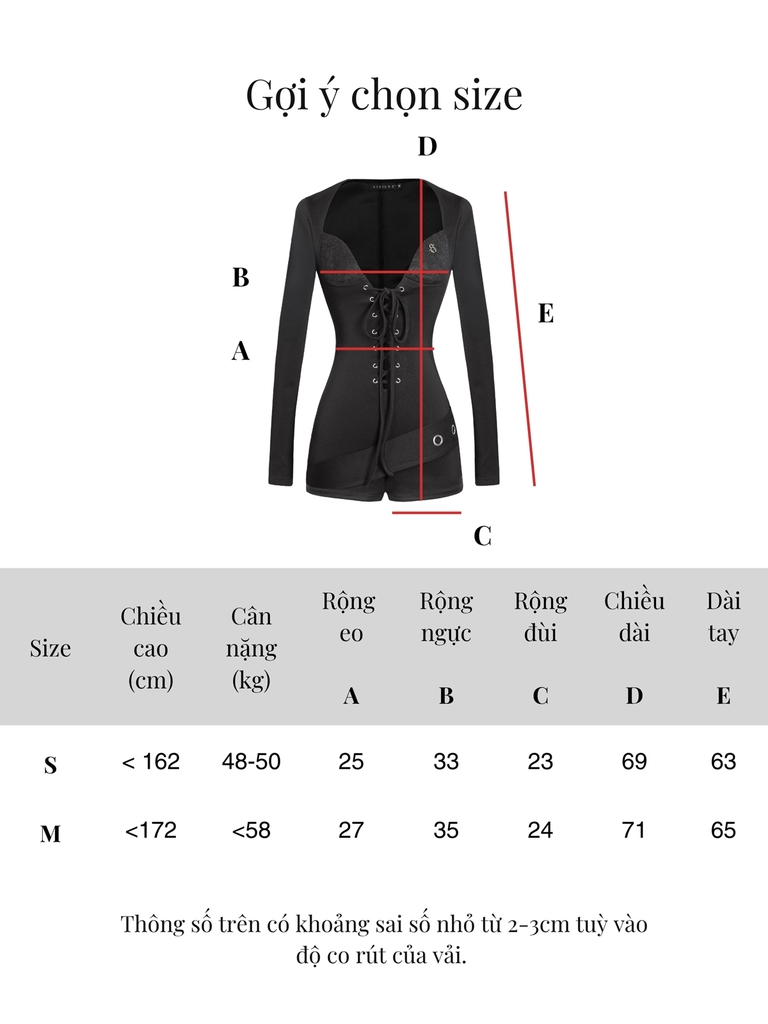 | Size | Rộng eo | Rộng ngực | Rộng mông | Chiều dài |