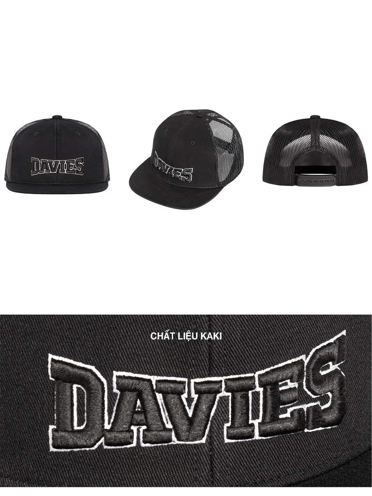 Chữ Davies được thêu cách điệu mặt trước của mũ – đây là dấu ấn của bản lĩnh và tự hào qua từng mũi chỉ thêu. Logo được thực hiện bằng kỹ thuật thêu nổi 3D với sợi chỉ mật độ cao, tạo ra chiều sâu và khả năng bắt sáng đầy cuốn hút dưới ánh nắng hay đèn đường về đêm.