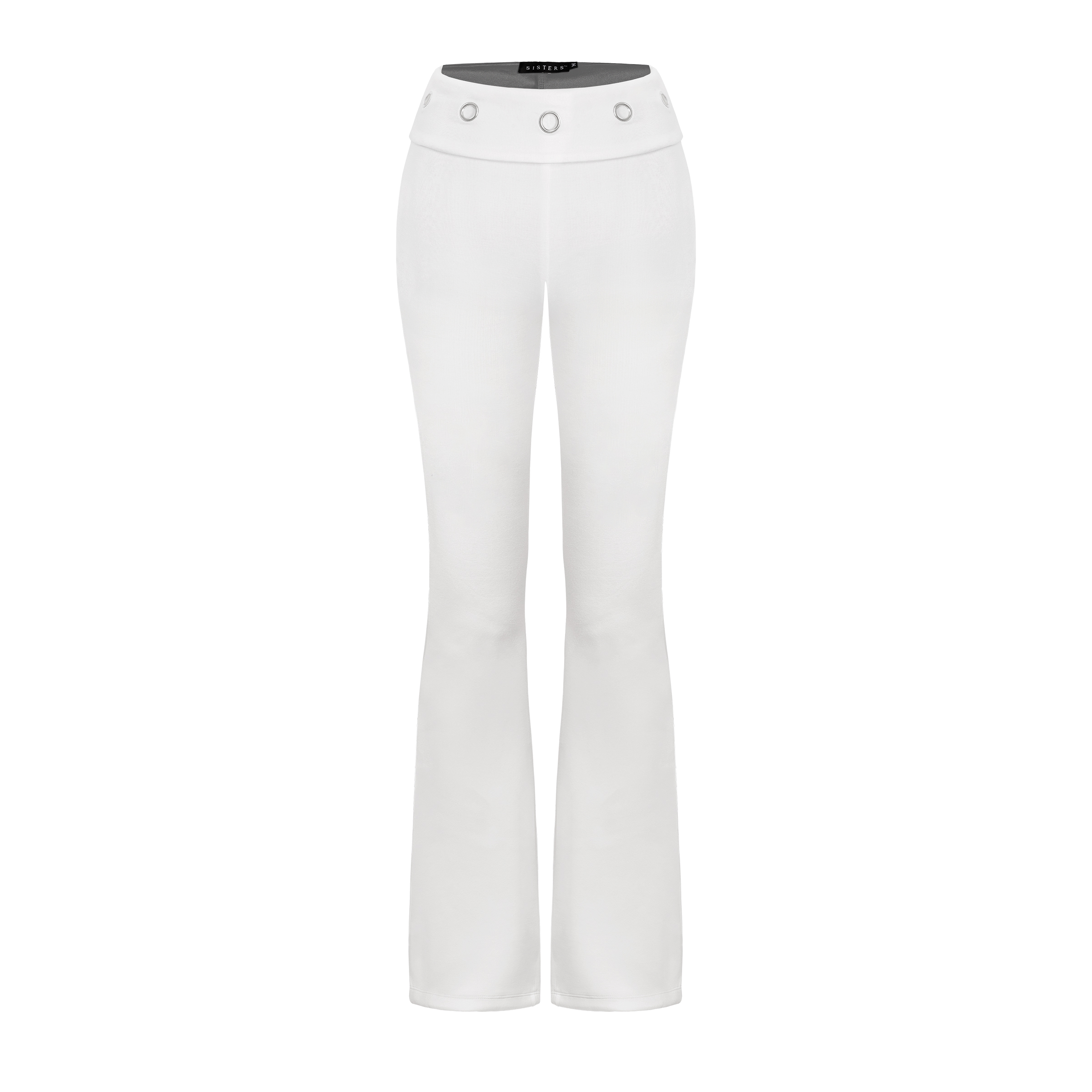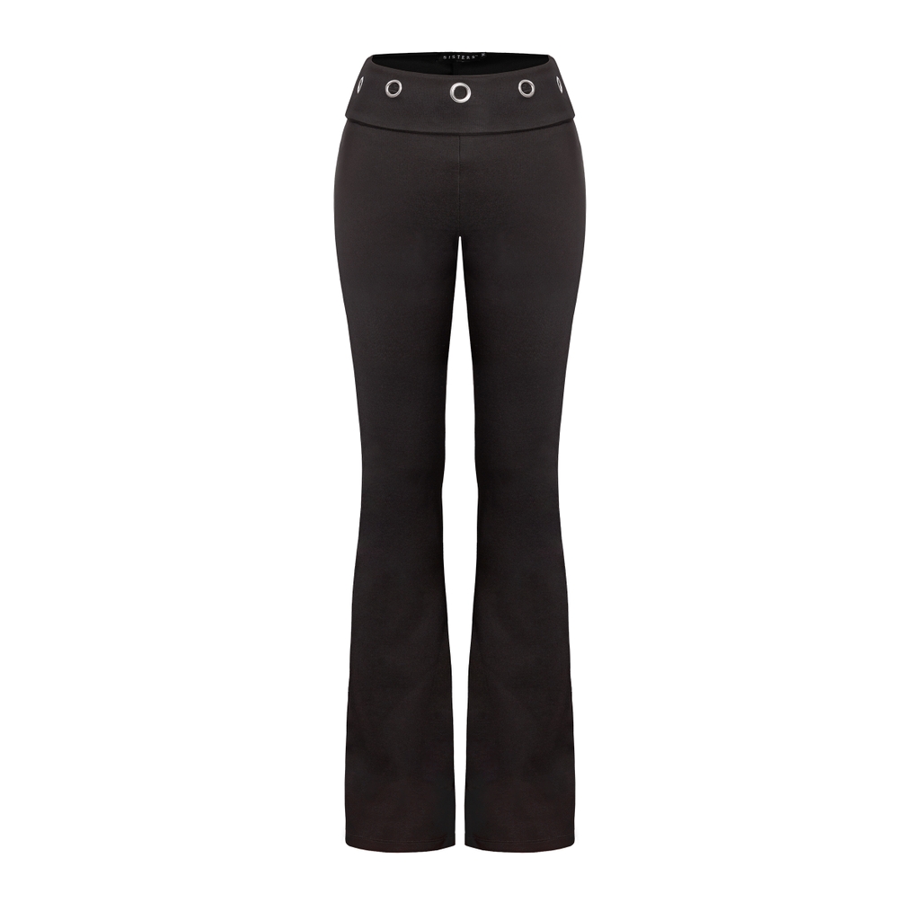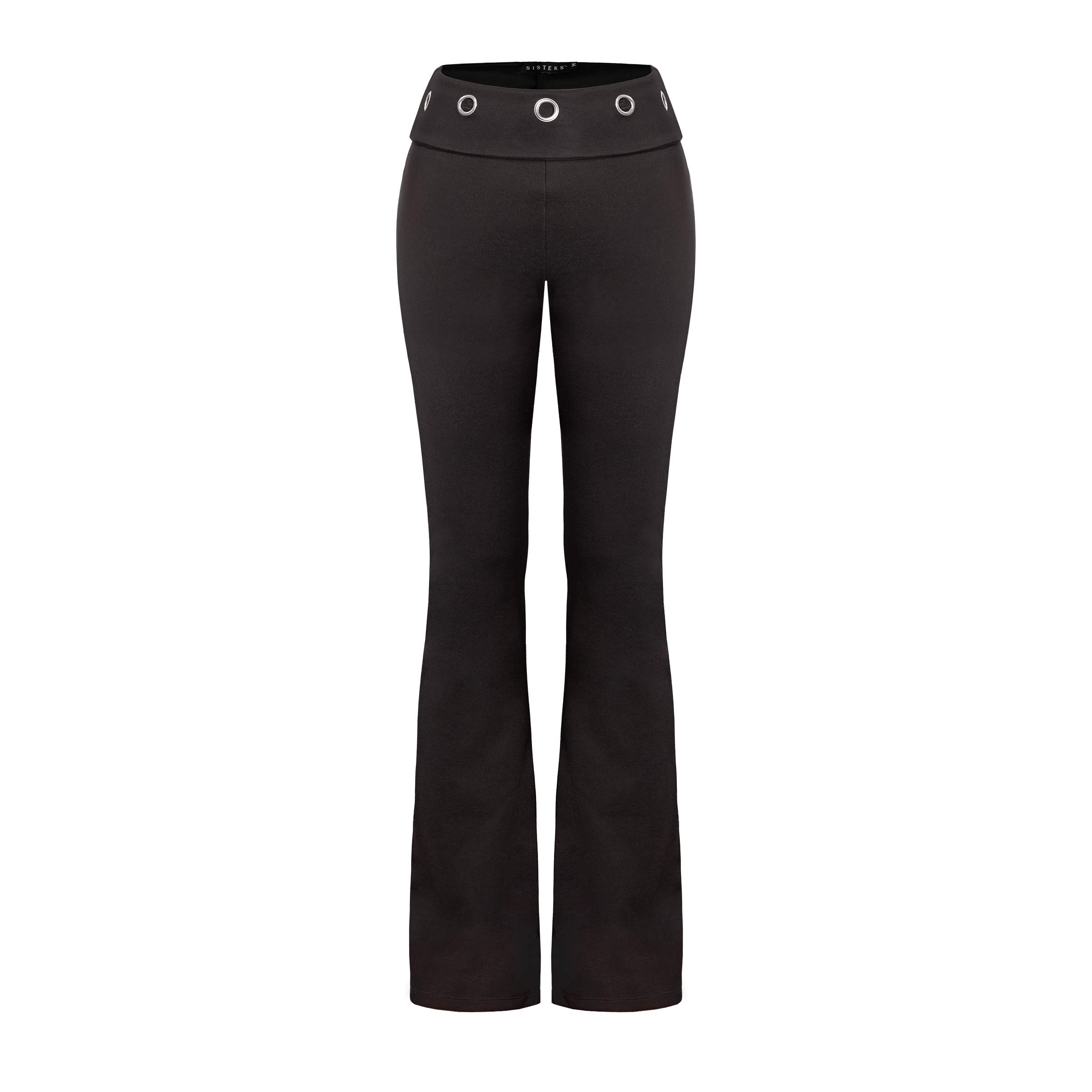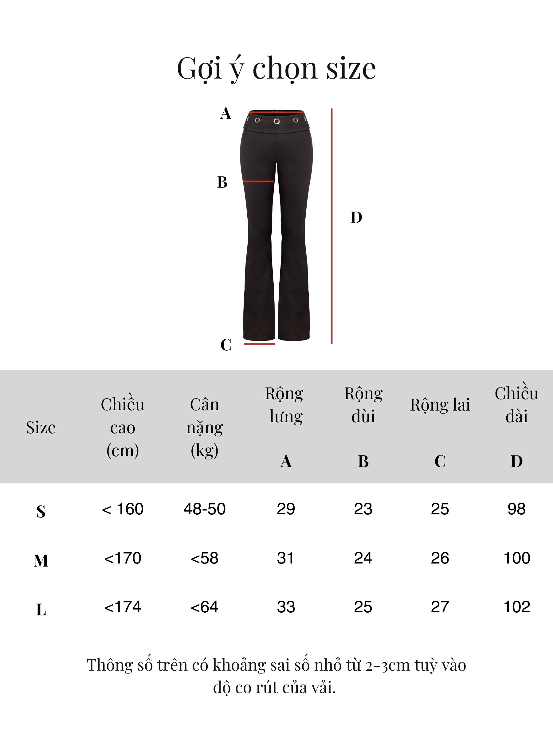 Quần ống loe có thiết kế lưng lật táo bạo phối cùng phần khoen kim loại cá tính, tag logo inox tinh xảo tạo nên sự khác biệt.