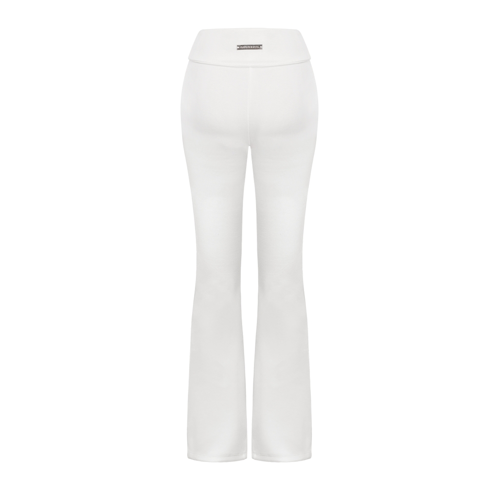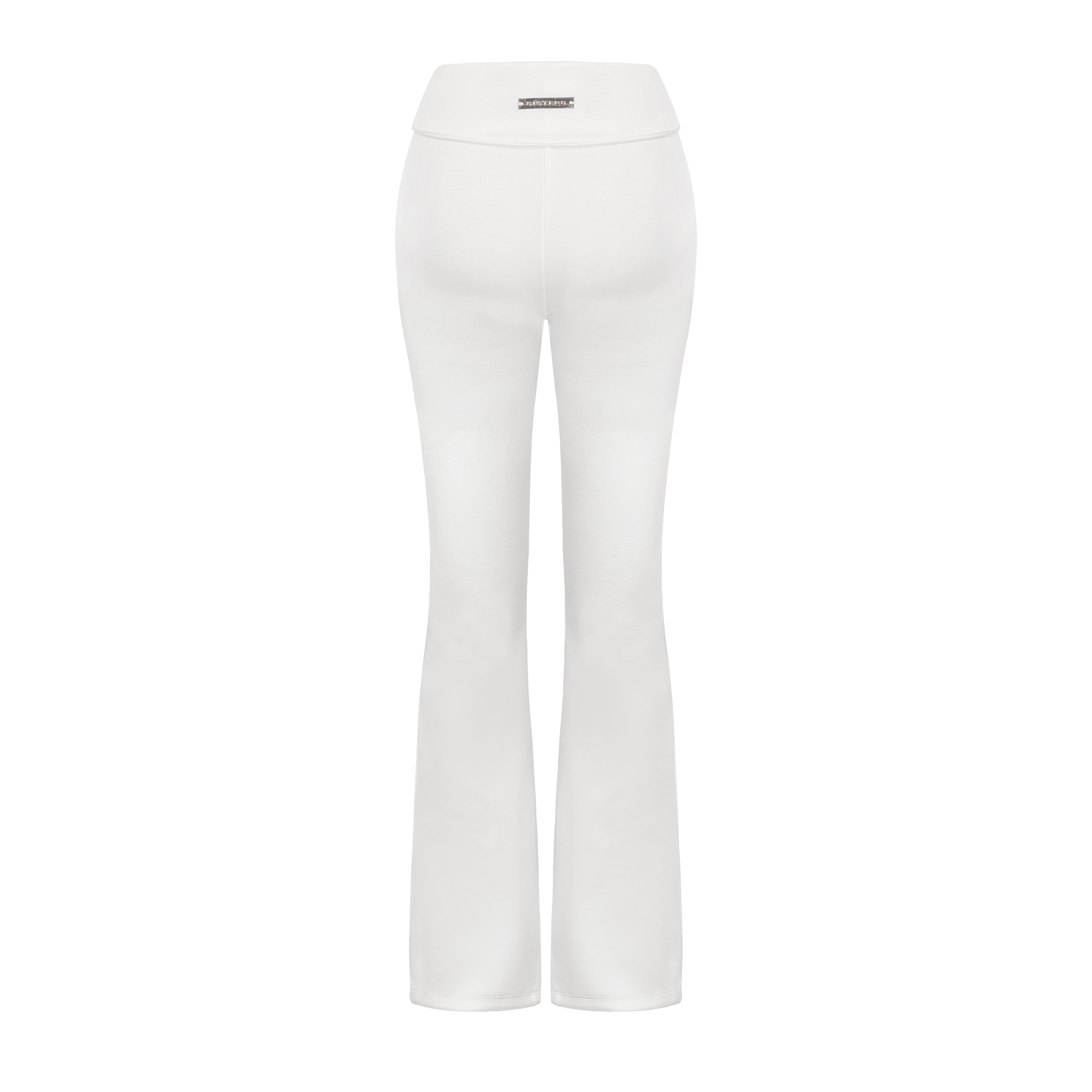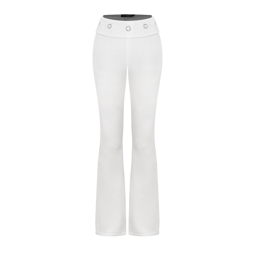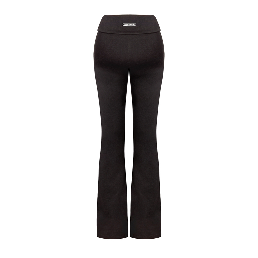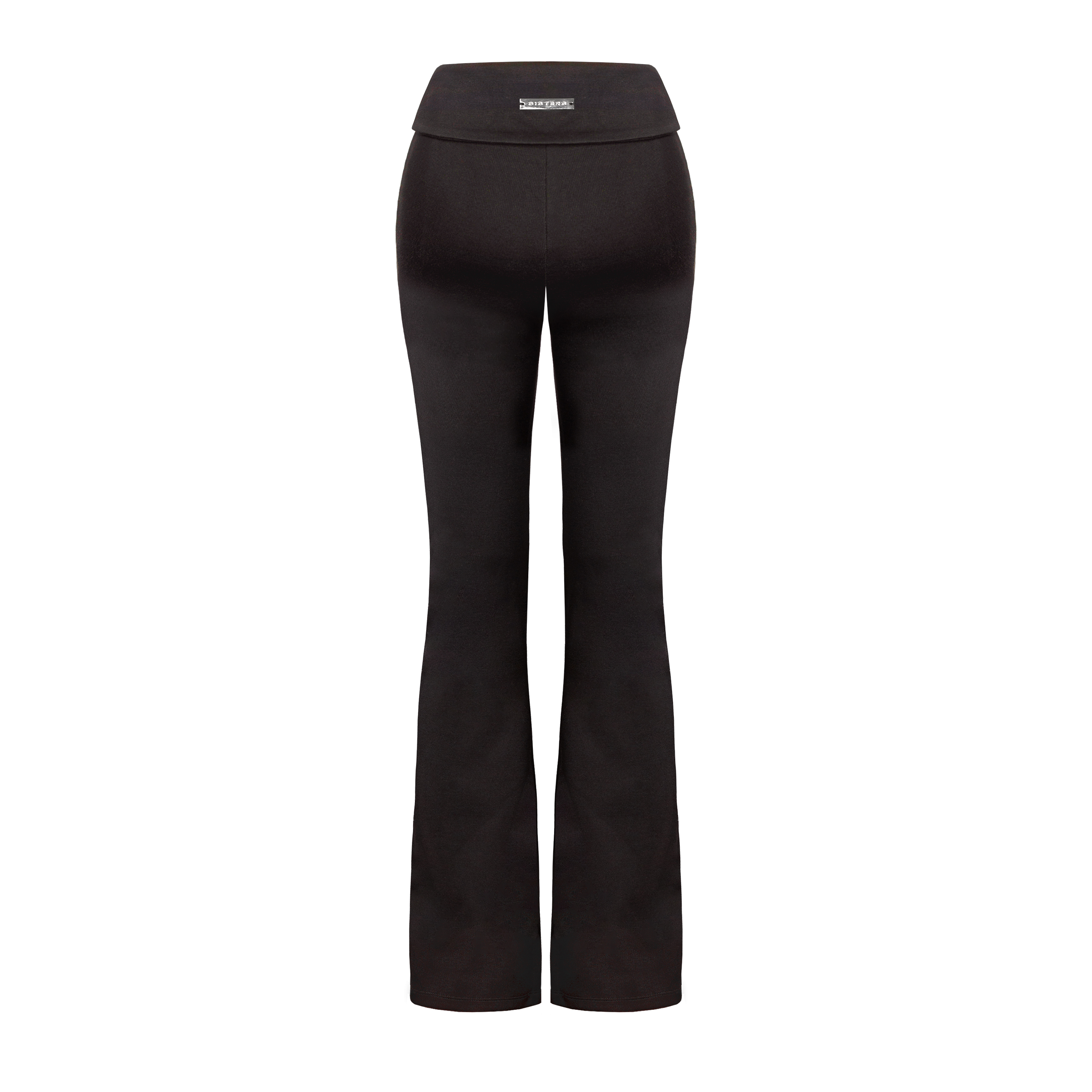 Quần ống loe có thiết kế lưng lật táo bạo phối cùng phần khoen kim loại cá tính, tag logo inox tinh xảo tạo nên sự khác biệt.