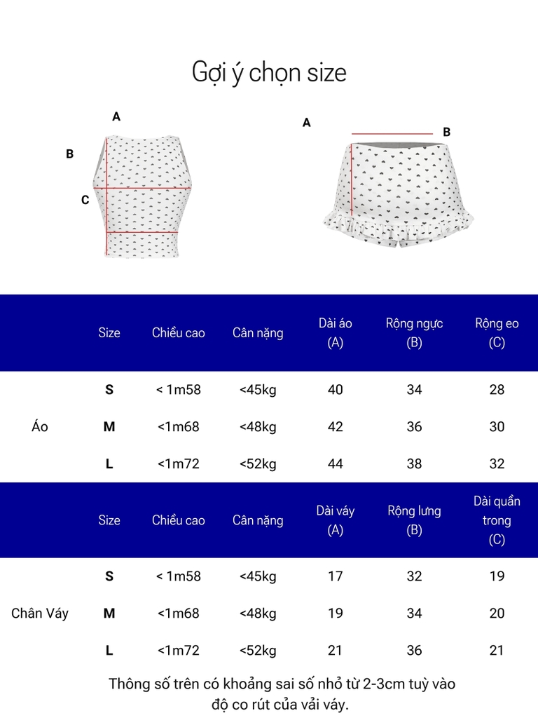 | Size | Dài váy | Rộng lưng | Rộng ống quần trong | Dài quần trong |