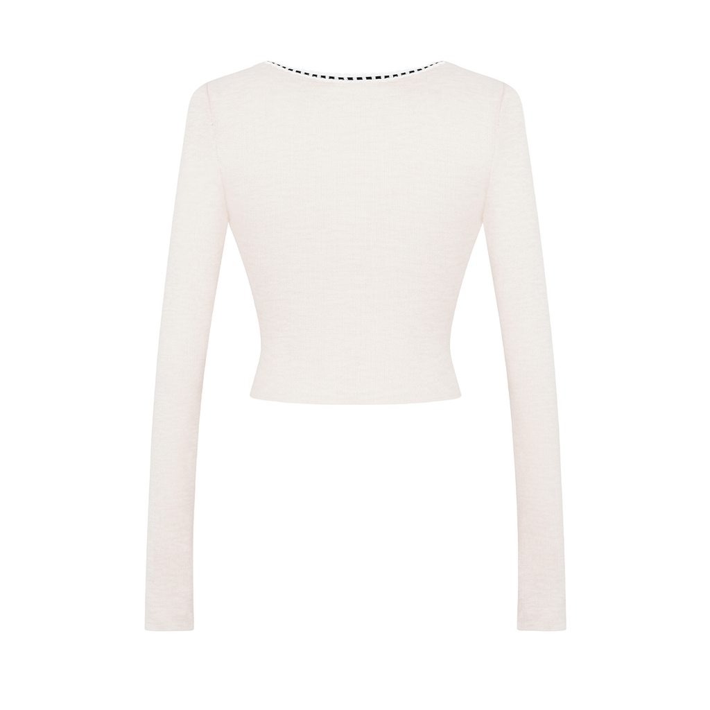 Sắc kem của Ribbon Set mang đến cảm giác dịu ngọt và tinh khôi. Trên nền vải thun rib muối tiêu độc đáo, bộ trang phục hiện lên thật xinh xắn và kiêu kỳ.